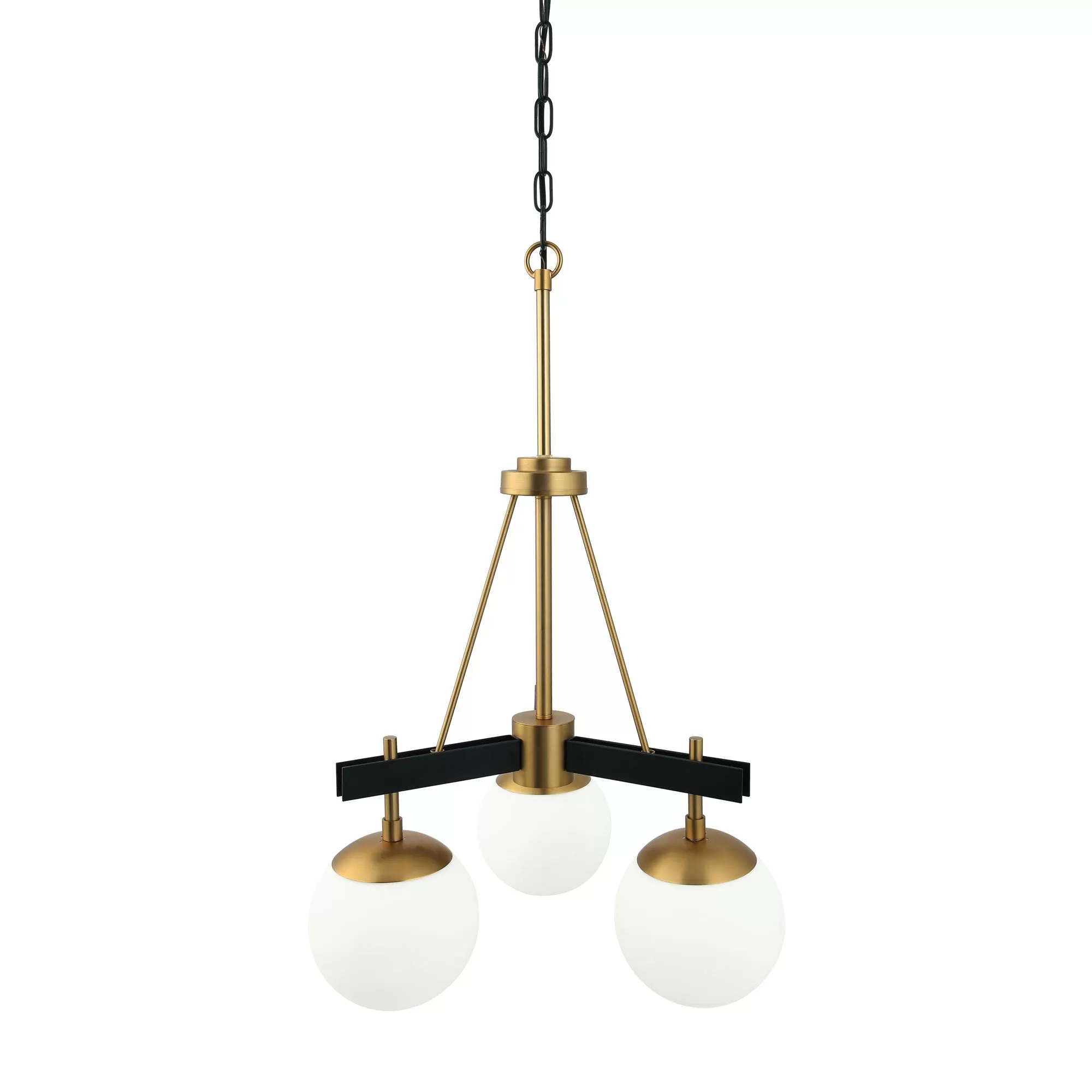 Mid-Century and Post Modern Design Influences. Gorgeous White Recycled Glass Globes. Easy Re-lamping. Two Tone Satin Black with Brass or Polished Nickel with Black Finshes.