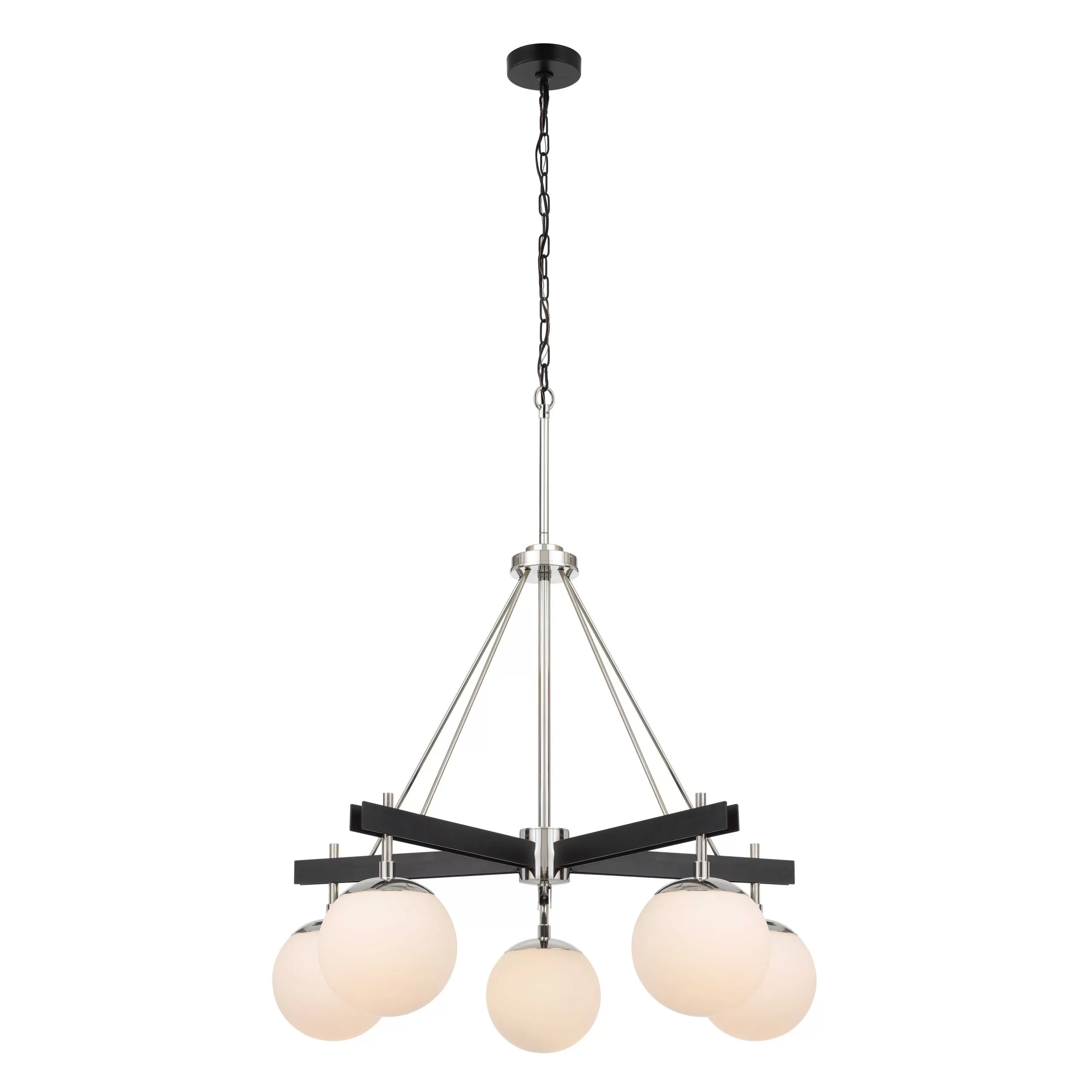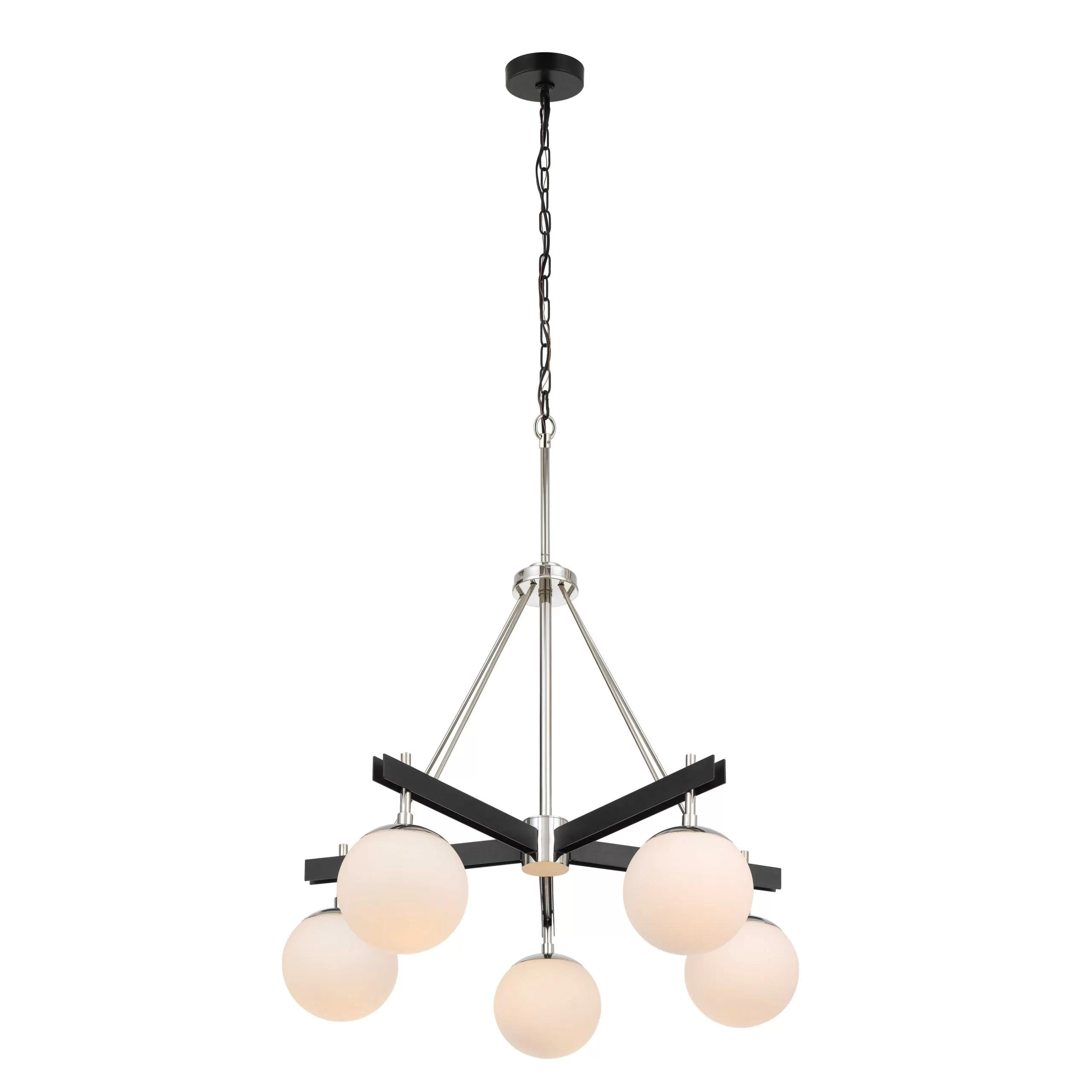 Mid-Century and Post Modern Design Influences. Gorgeous White Recycled Glass Globes. Easy Re-lamping. Two Tone Satin Black with Brass or Polished Nickel with Black Finshes.