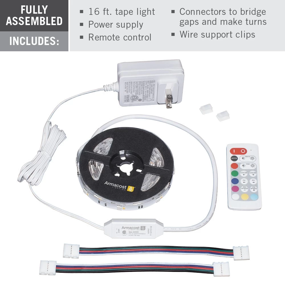 The Armacost Lighting RibbonFlex Smart Home Multicolor RGB+ White LED strip light kit is the perfect solution for versatile indoor accent lighting including under cabinets, shelving, decks, and patios. Full-range brightness and color control with included wireless remote; RF technology works through walls up to 50 ft. away. Adhesive backing for easy installation.