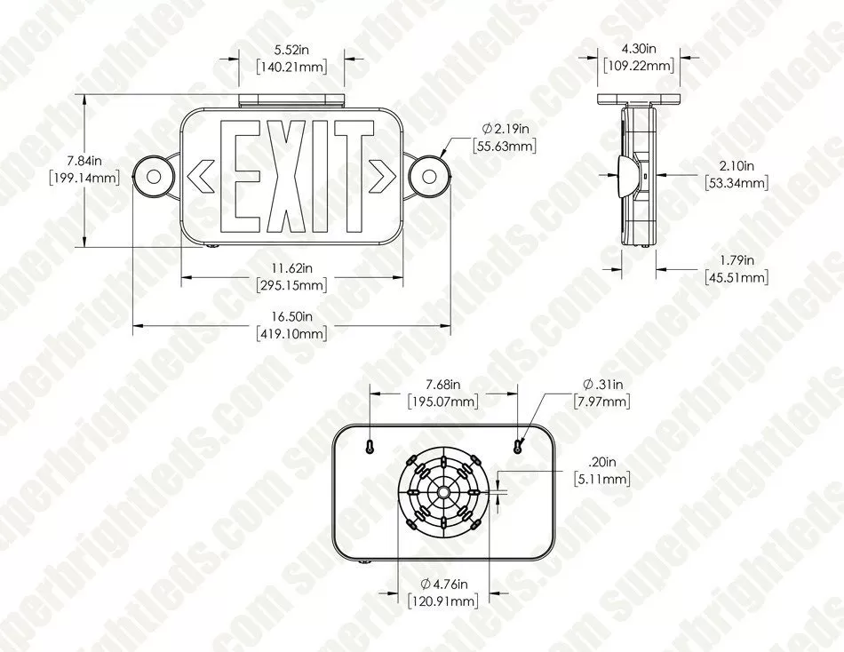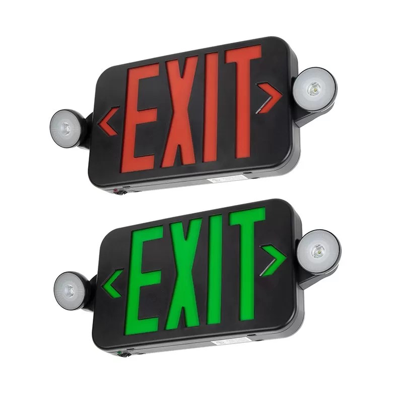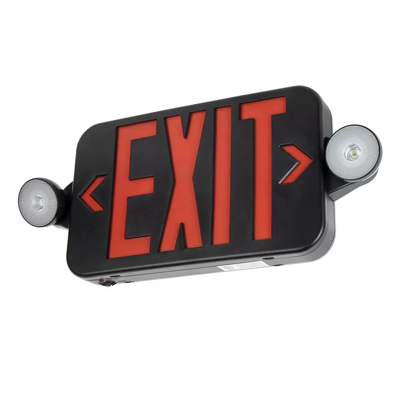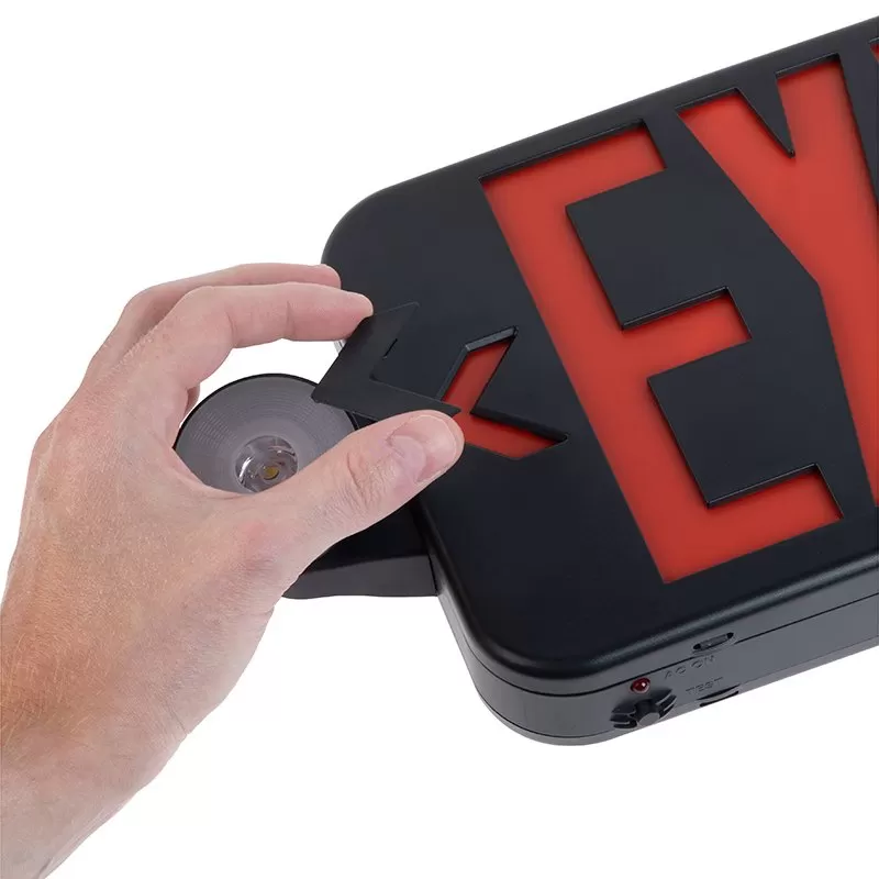 The combination LED exit sign with a battery backup is a reliable emergency signage solution for commercial and industrial locations. In the event of a power outage, the integrated Ni-MH battery produces up to 90+ minutes of emergency lighting from a 24-hour charge. Match any certifications by switching out the lenses using the included red and green inserts and by using the switch inside the light to select the color of LEDs, emphasizing the color of the sign and making it easier to read. Customize the light further using the extra faceplate for double-sided signage, remove the arrows to point to the exit direction, or rotate the light heads. The light is constructed with a black flame-retardant thermoplastic with a charge indicator and test button.