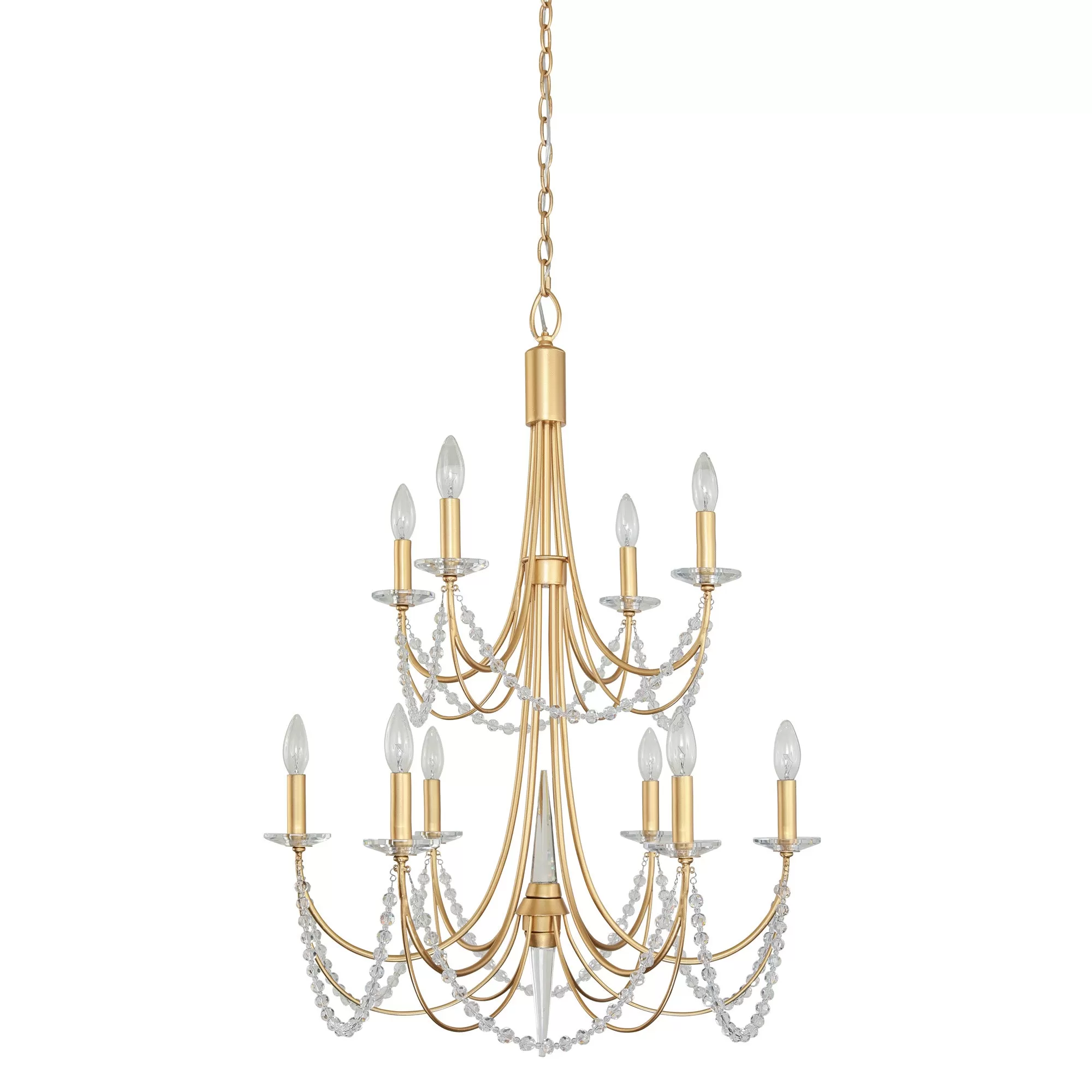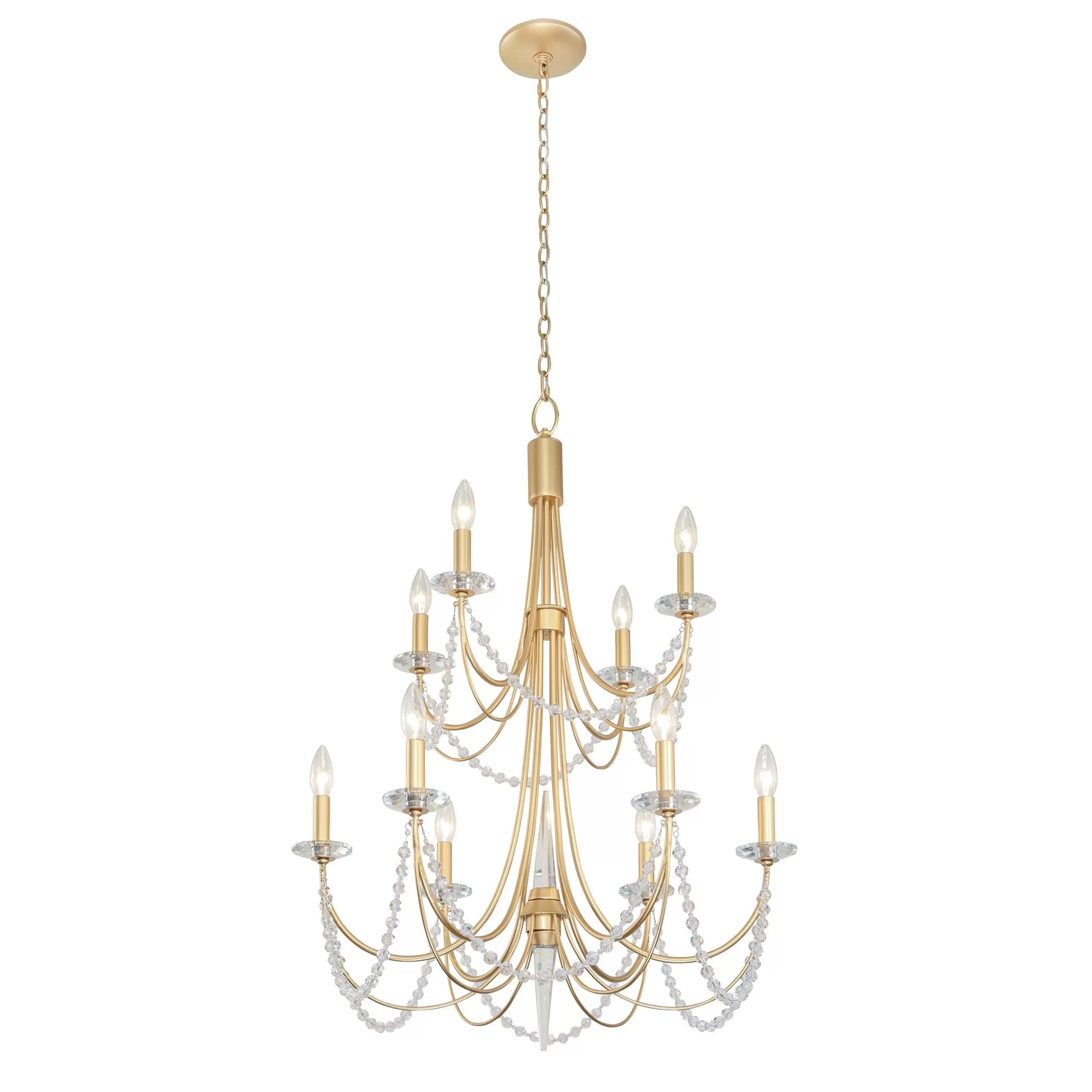 Inspired by an old Williamsburg chandelier. Brentwood is finished in French Gold and Carbon Black. Draped in bohemian crystals and dressed in K9 crystals spears and bebeches.