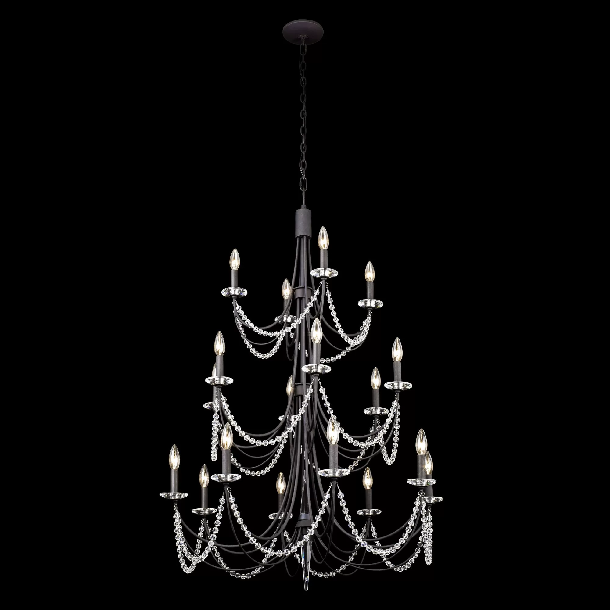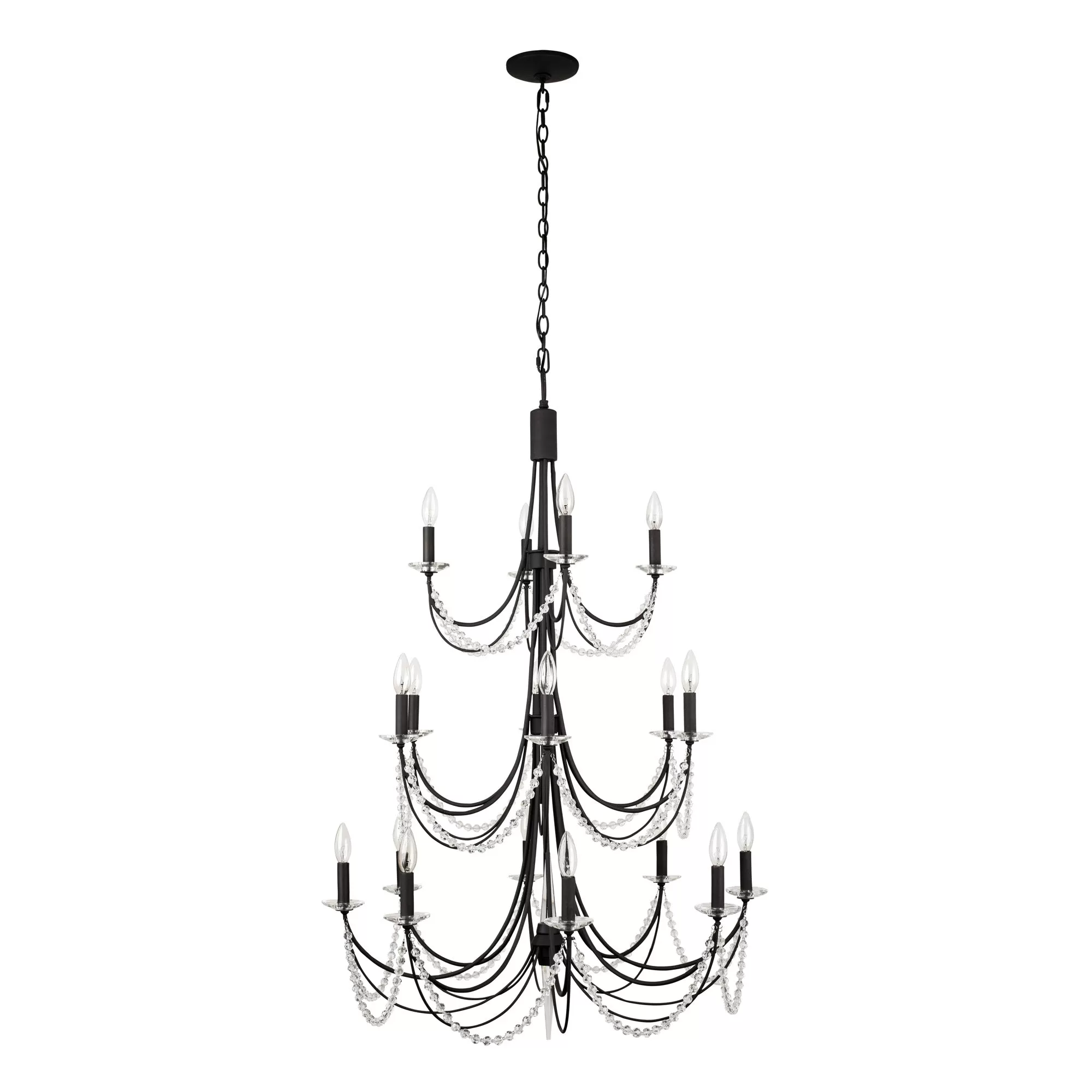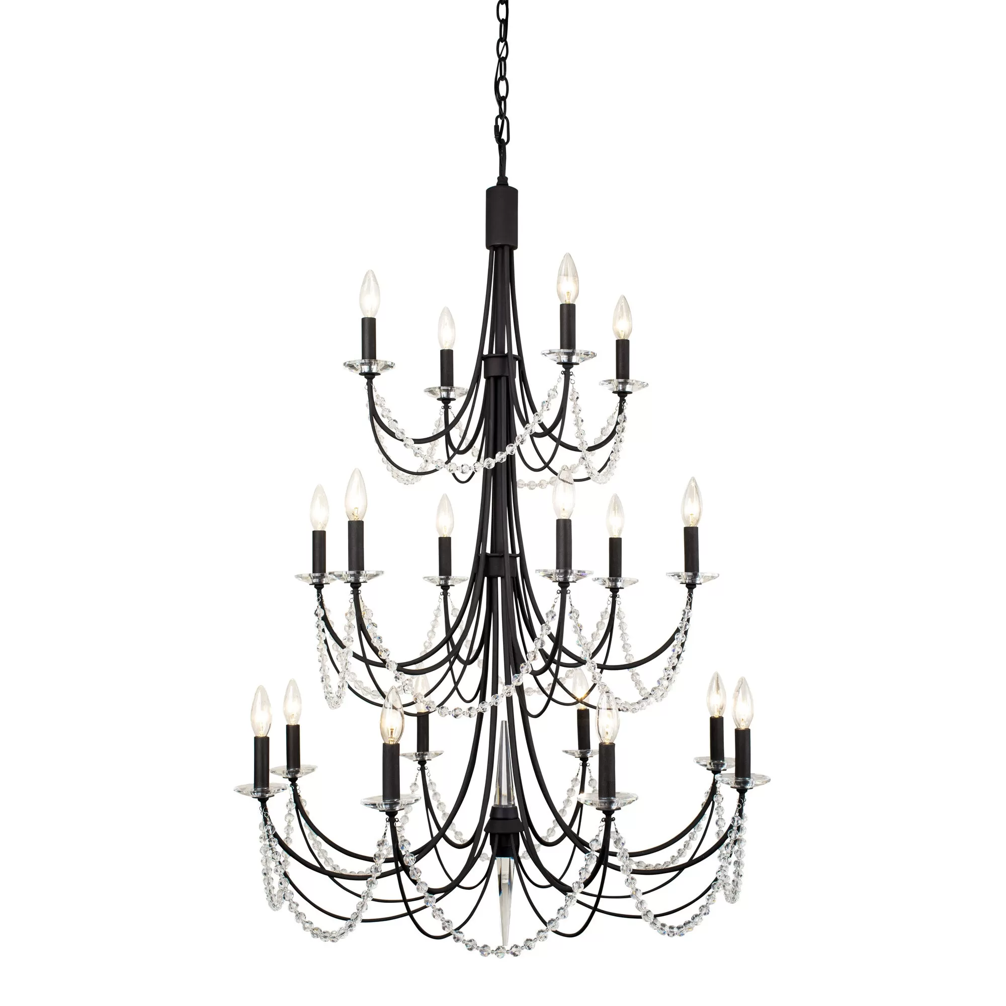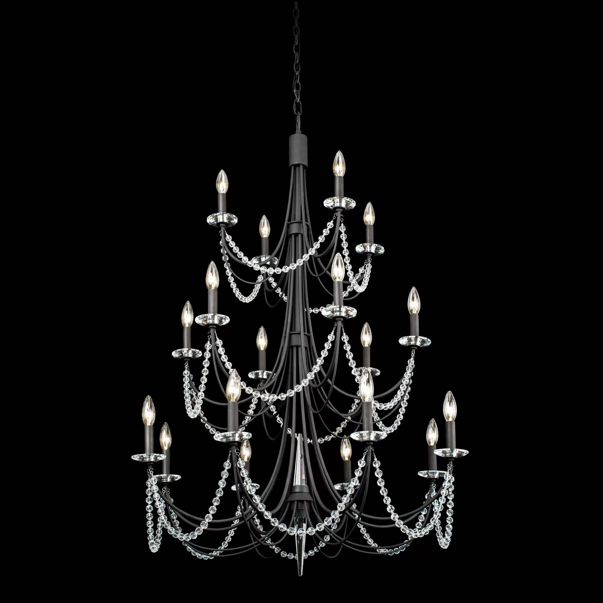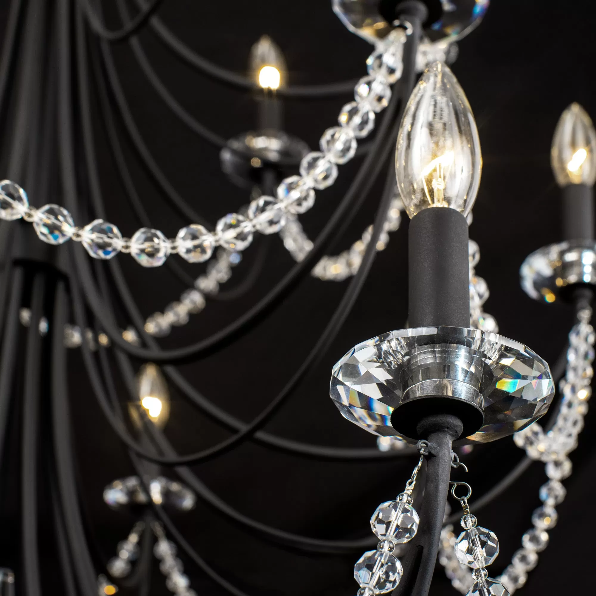 Inspired by an old Williamsburg chandelier. Brentwood is finished in French Gold and Carbon Black. Draped in bohemian crystals and dressed in K9 crystals spears and bebeches.