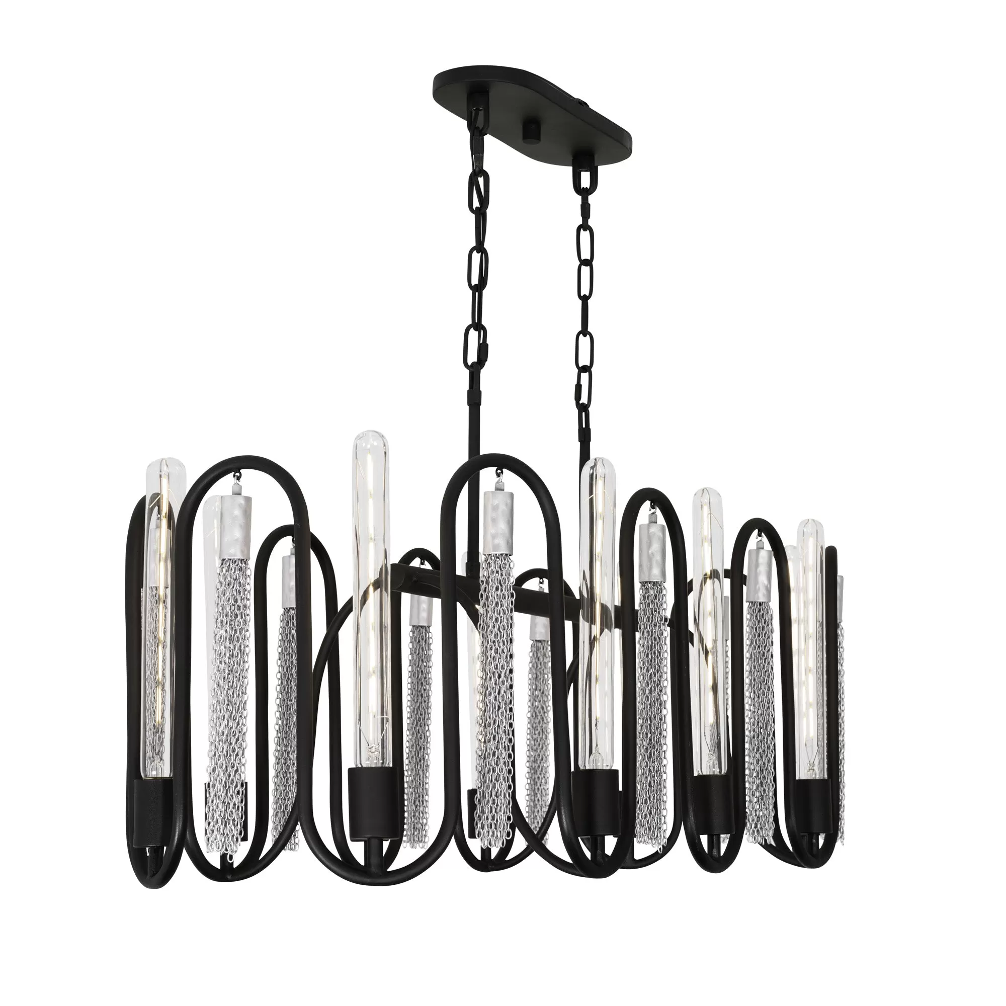 The fluid grace of the Darden Collection conveys a bold, yet tempered strength as the eye follows the parabolic connections between Edison bulb stalagmites and hand-made jewelry chain stalactites. Hints of classic Greek design are apparent in its footprint while gold or silver accents evoke a bohemian warmth. The eye is intrigued, searching for a beginning or an end. The result – mesmerizing beauty.