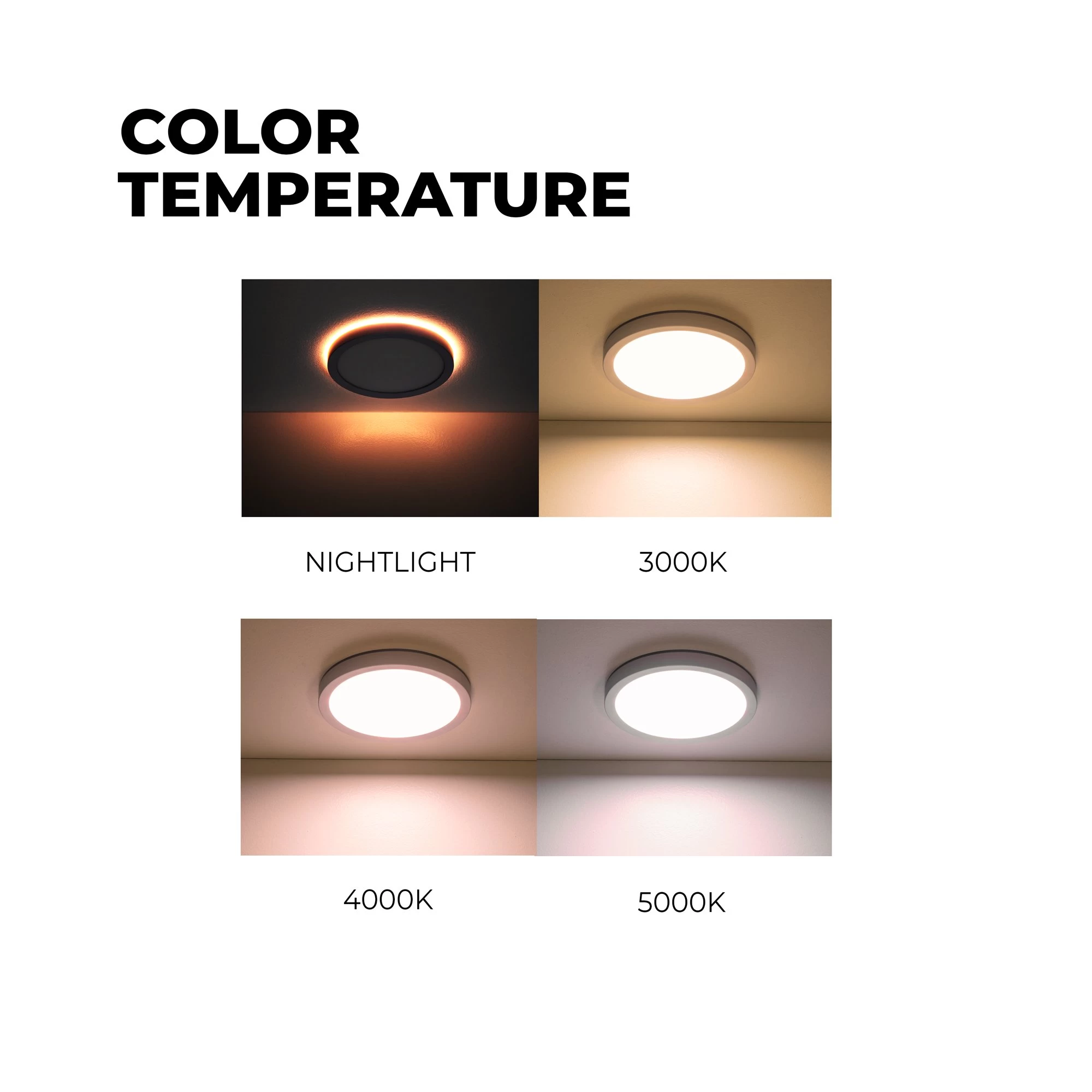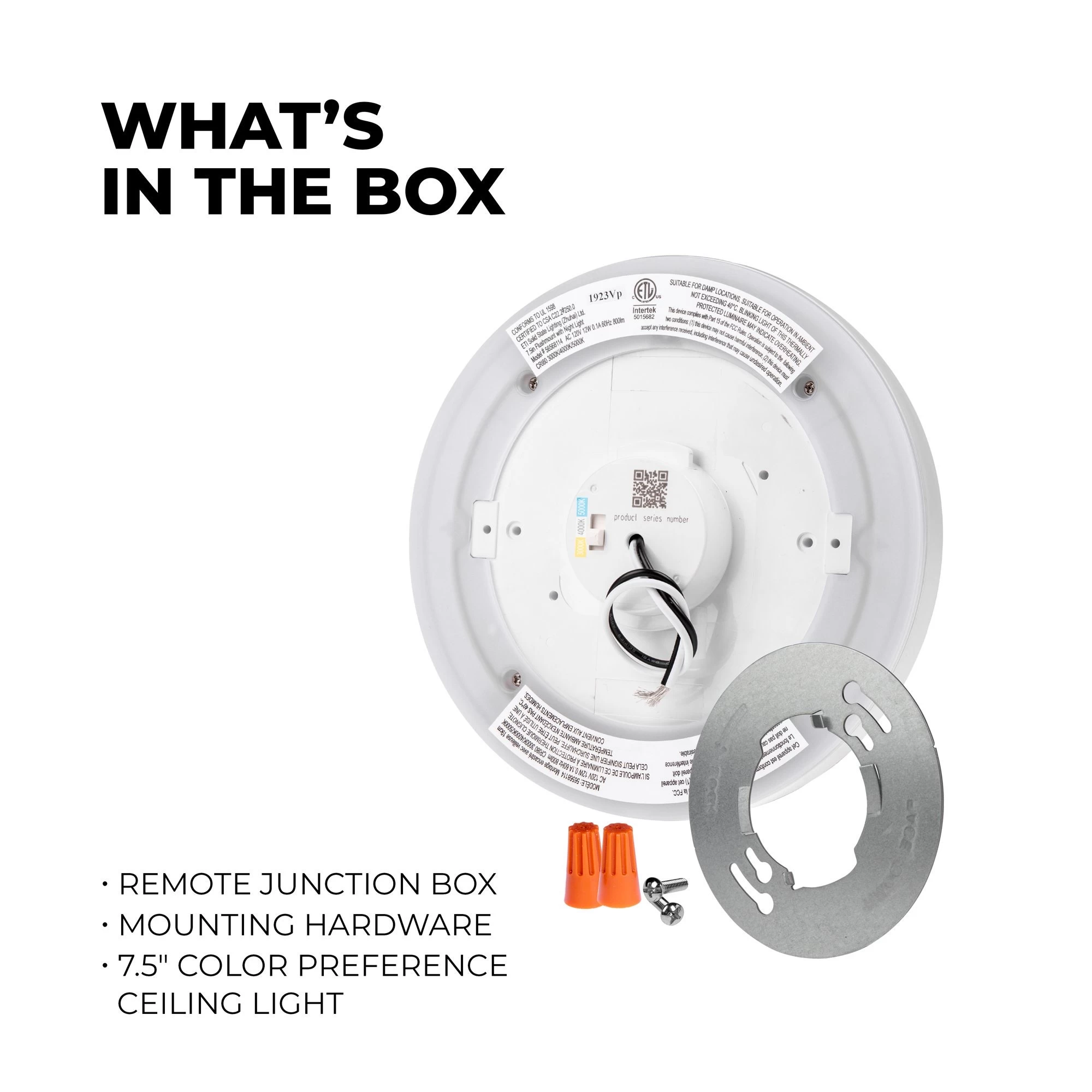 The ETi 7.5-inch TwistFit LowPro Color Preference® downlight with nightlight trim is a low-profile flush mount downlight with the innovative TwistFit mounting system. The energy-efficient fixture delivers 800 lumens, replacing a traditional 60-watt incandescent, while consuming only 12 watts. The downlight has three color temperatures, 3000K, 4000K, and 5000K, selectable via a switch on the back of the fixture. The TwistFit design allows you to mount the bracket to a standard junction box, wire the fixture, and twist the fixture into place for easy installation. Use the wall switch to change from the primary light to the 2000K NightlightR trim light, which delivers an ultra-warm ambient light on the ceiling around the fixture. The TRIAC dimmable fixture is IC rated for direct contact with insulation.