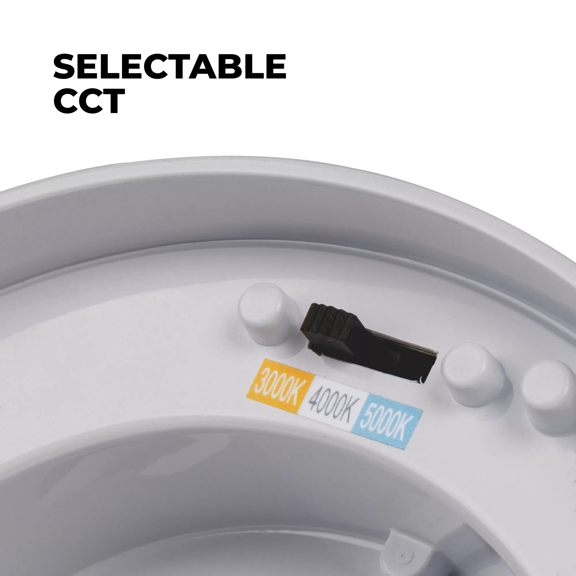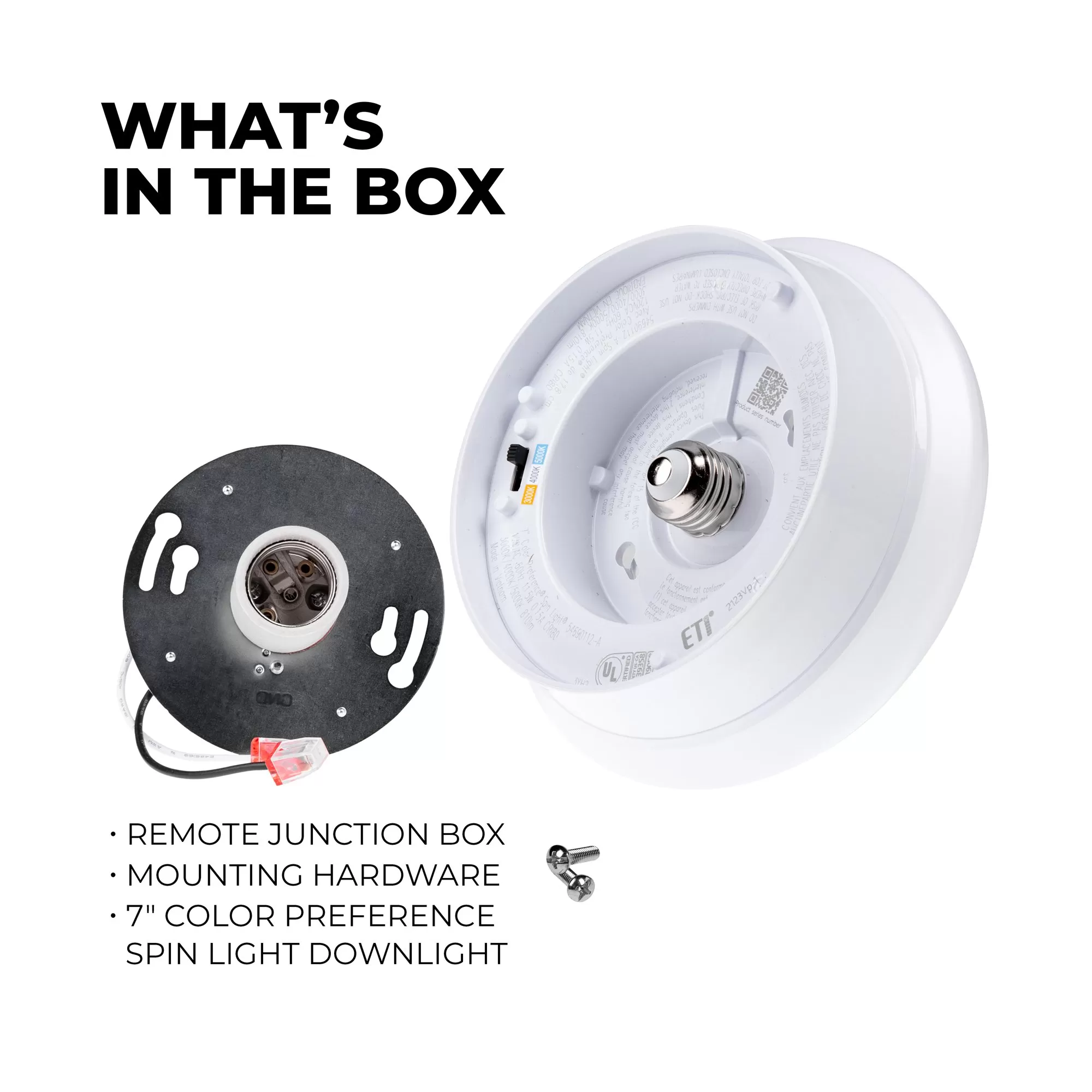 Use the ETi 7″ Color Preference® LED Spin Light® downlight to upgrade your basic lamp holder to a modern, integrated LED fixture. Screw the E26 base into the holder like a standard lightbulb to transform your bare lamp holder into an Energy Star Certified fixture with no wiring required! The round downlight has three color temperatures, 3000K, 4000K, and 5000K, selectable via a switch on the back of the light. It delivers 810 lumens at 11.5 watts, replacing a traditional 60-watt incandescent. The downlight includes a SPEEDMOUNT® bracket for junction box installation in remodeling and new construction installations.