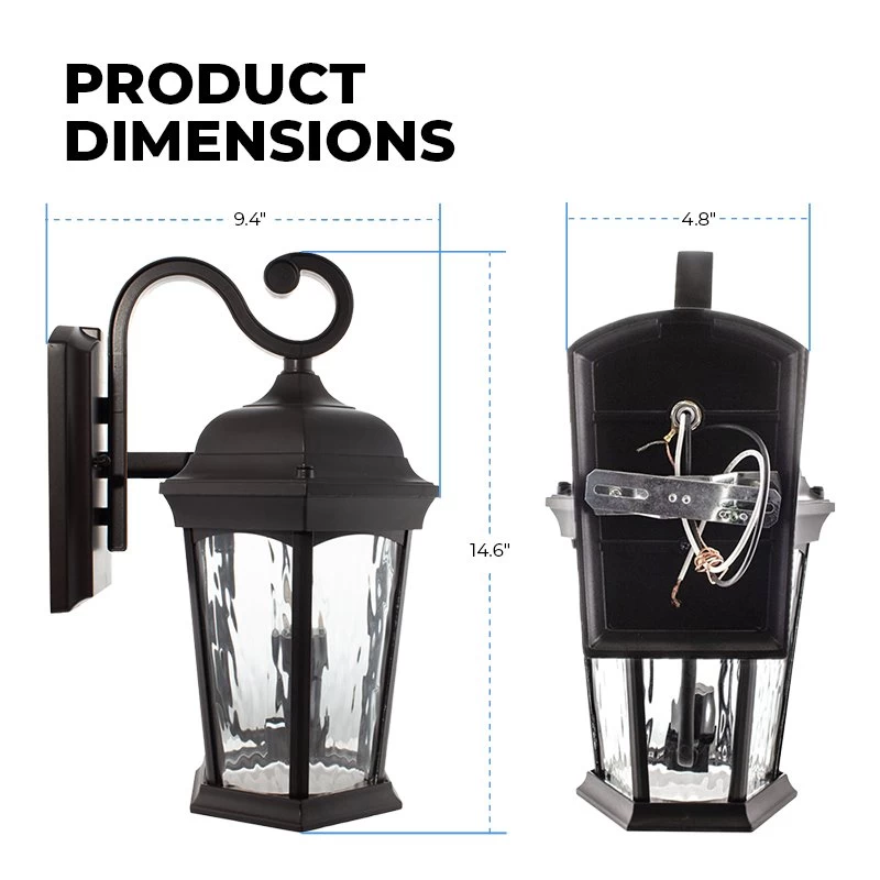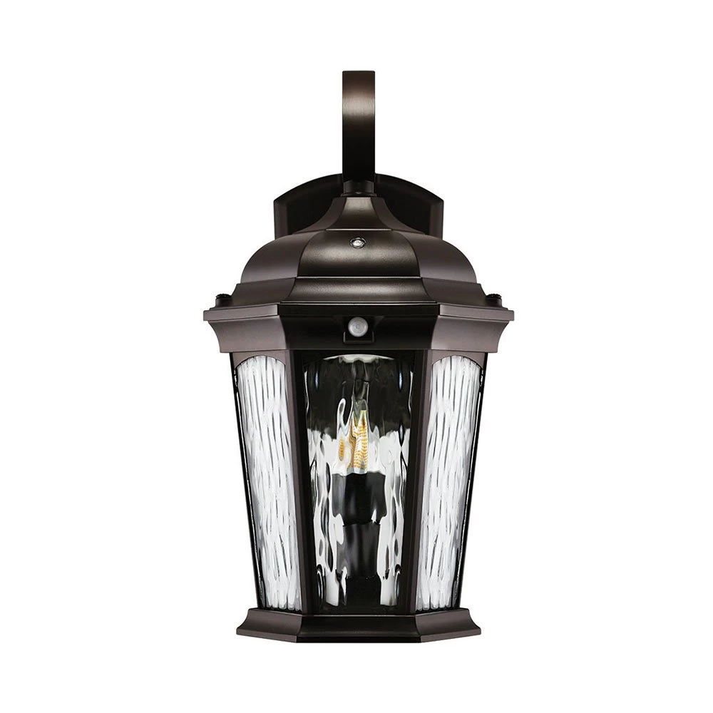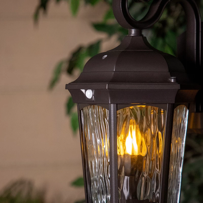 The Euri Lighting water glass porch light with a flicker flame bulb decorates and illuminates, elevating your outdoor lighting. An inventive combination of LED-integrated and bulb-ready lighting, the outdoor lantern has dusk-to-dawn technology, motion sensor detection, and an enclosed bulb with realistic flicker flame programming. At sunset, the enclosed flame bulb turns on, mimicking real flames. When motion is detected, the integrated fixture activates at full brightness of 1,200 lumens, ensuring safety and security. The decorative lantern offers a timeless aesthetic appeal with water glass, a bronze or white finish, and a swooping S-hook arm.