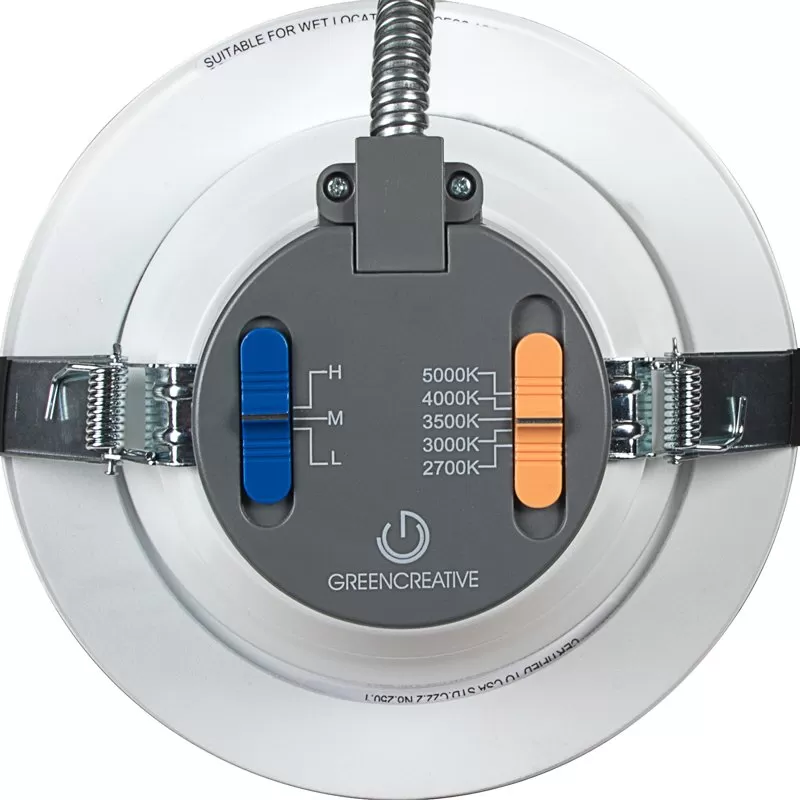The 6″ SelectFIT G2 LED Downlight by Green Creative features five color temperatures, three wattages, and dual-dimming operation. Using the switches on the top of the fixture, select the wattage and color temperature that best suit the application. The recessed downlight also has 0-10V and TRIAC dimming, ensuring the downlight is ideal for any installation. The deep recessed lightsoursce reduces glare and provides 80° of uniform light. SLFT6-9CCT5S-DUALDIM is IC rated for direct contact with insulation.