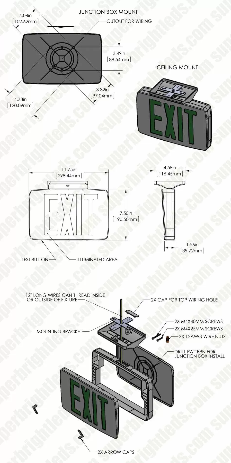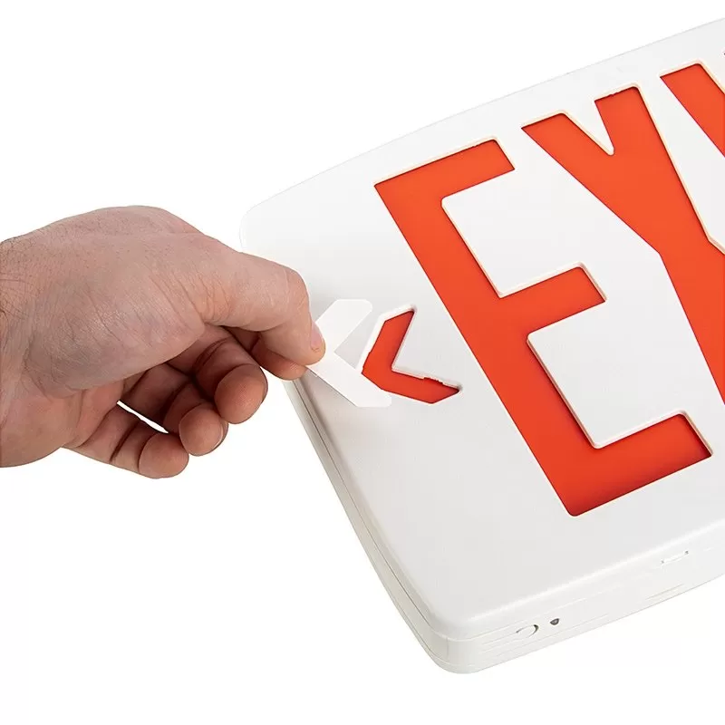 This LED exit sign emits attention-grabbing, long-lasting illumination and operates on 120-277 VAC. The 2.5-watt sign has a battery backup (NiCd 4.8V 500mAh) that provides 3 hours of light on a 24-hour charge. Construction consists of an injection-molded, flame-retardant thermoplastic housing. The LED exit sign comes with either red or green lettering, an extra faceplate, and arrow covers. Use the included canopy for ceiling installation.The light can also be mounted on wall junction boxes or on its side. A test button and LED charge indicator are located on the side of the exit sign. This UL-924-Listed LED light meets standards for emergency lighting and can be used in damp locations. Installation hardware is included. Lifetime warranty (limited 2-year warranty on battery).