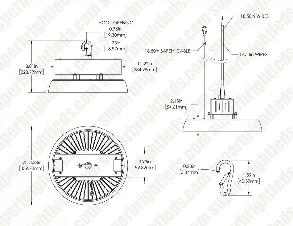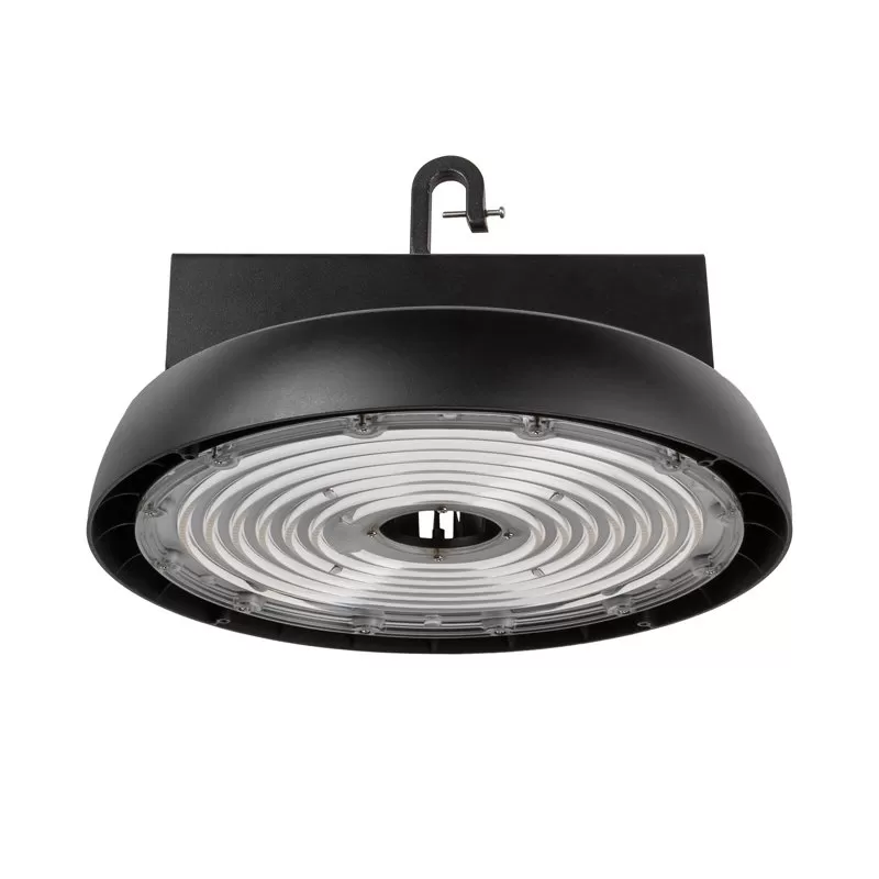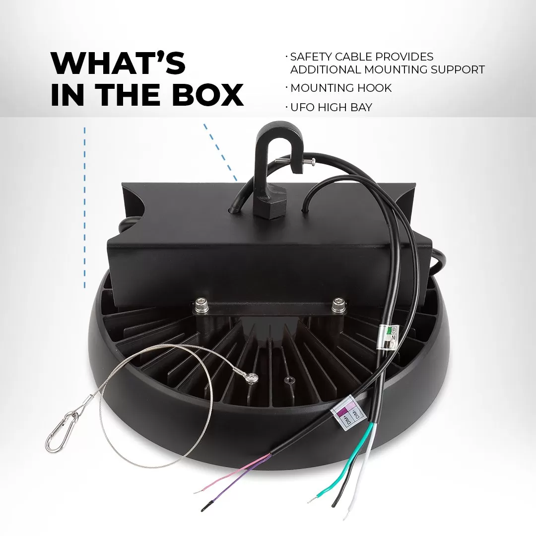 The high voltage UFO high bay provides an energy-efficient alternative to traditional metal halides. The compact and lightweight low profile aluminum housing has built-in heat sinks for passive cooling. The powder-coated exterior and IP65 rating resist corrosion and moisture. The polycarbonate lens delivers uniform, glare-free light. Install using the included safety cable and mounting hook. Fixture is compatible with an optional reflector and wire guard. Ideal for commercial applications in warehouses, factories, and gymnasiums.