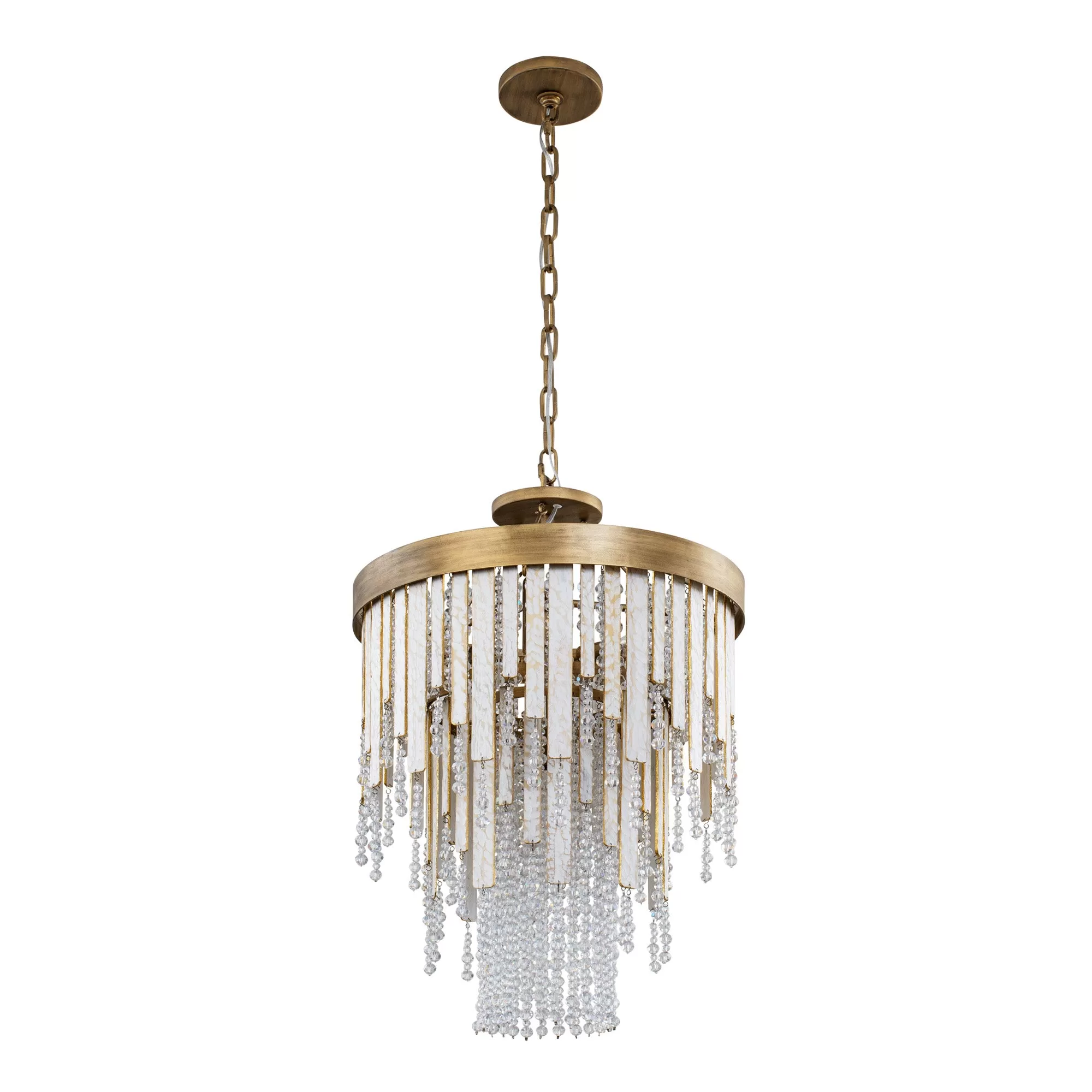 Ignite the swank and sultry soul of New Orleans. From feelings of a warm breeze blowing over a porch with gauzy drapes, to the decadence and passion of a smoky jazz club, Lafayette is sure to set the mood in any room. Echoing the look of live oaks with Spanish moss on dewy mornings, crystal beads sparkle around the hand-carved, white-and-gold washed reclaimed wood strips.