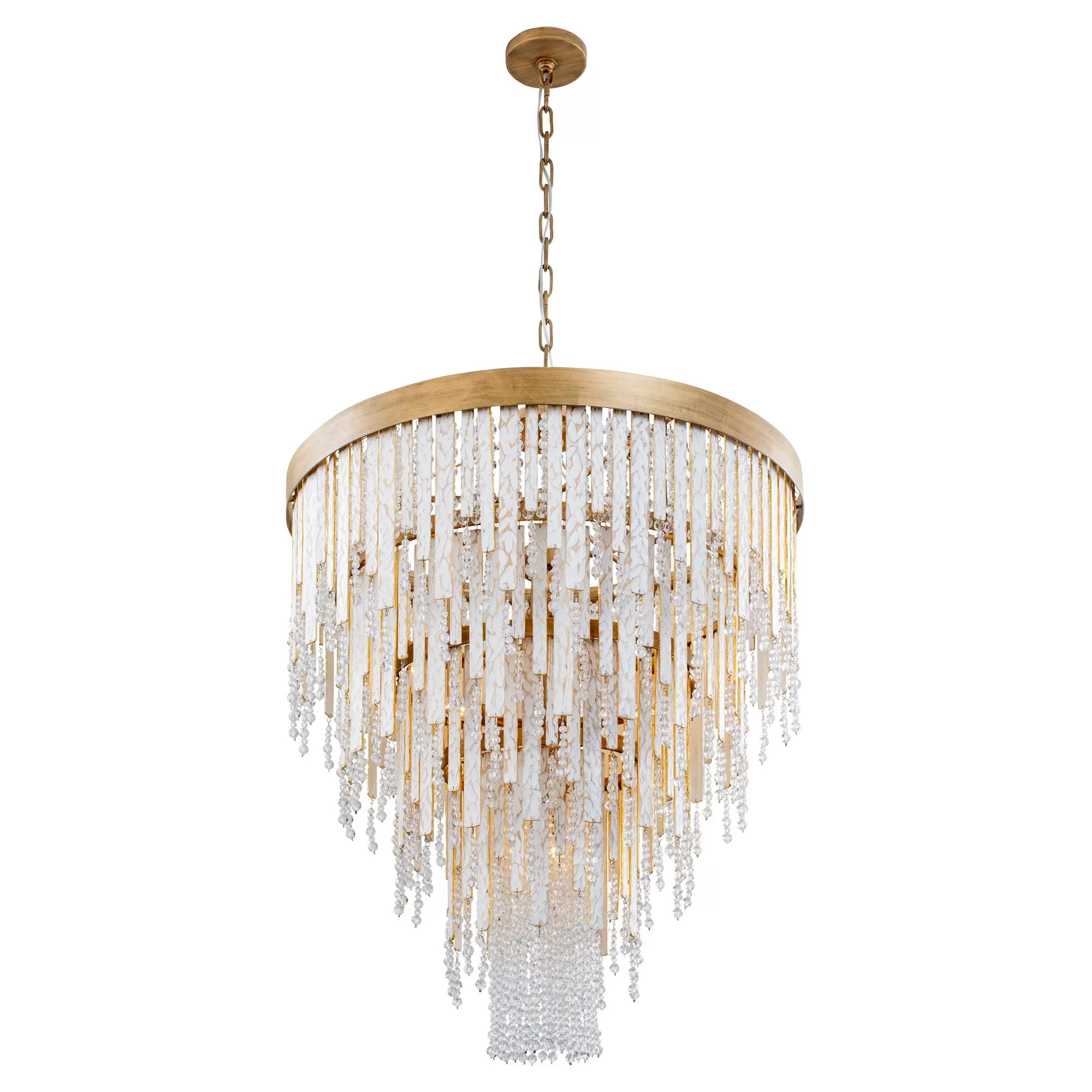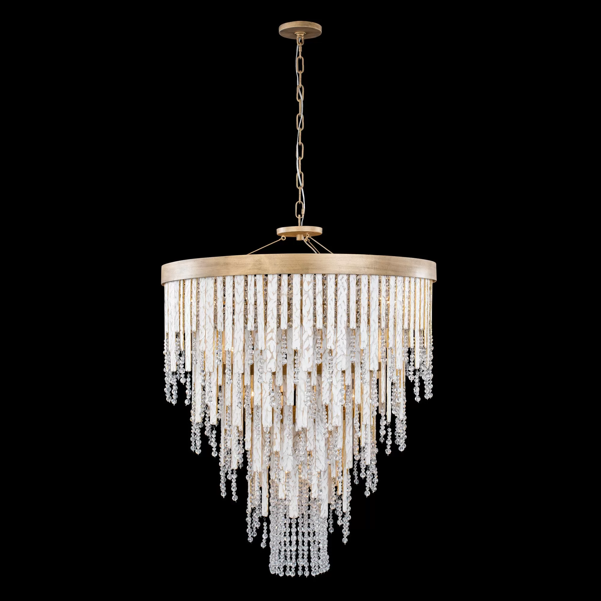 Ignite the swank and sultry soul of New Orleans. From feelings of a warm breeze blowing over a porch with gauzy drapes, to the decadence and passion of a smoky jazz club, Lafayette is sure to set the mood in any room. Echoing the look of live oaks with Spanish moss on dewy mornings, crystal beads sparkle around the hand-carved, white-and-gold washed reclaimed wood strips.