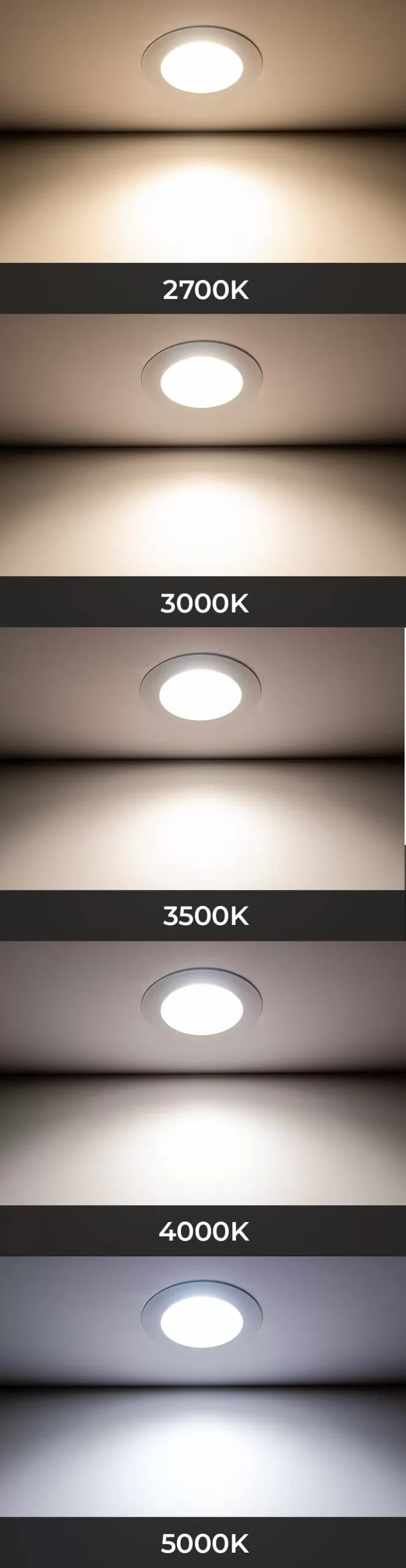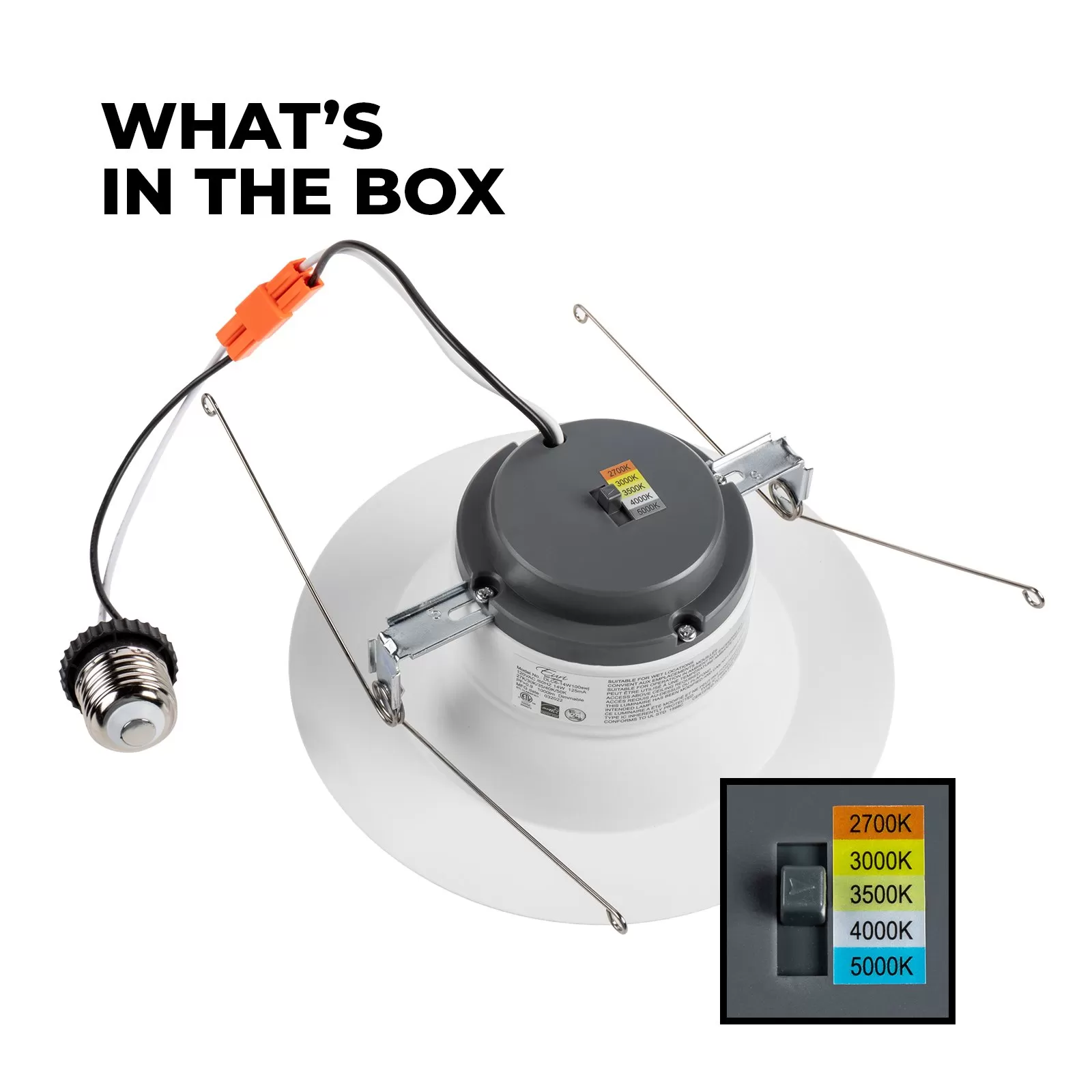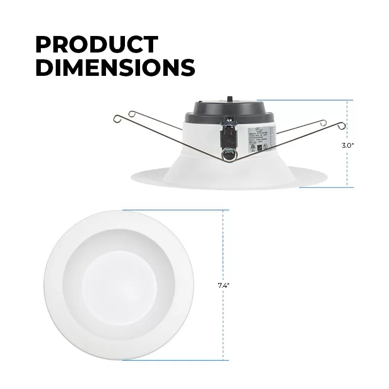 The 6” Commercial Downlight features five selectable CCT options and an E26 adapter for easy installation. Use the switch on the top of the fixture to select the color temperature best for the application setting. The included E26 adapter makes the LED downlight perfect for installations in existing can light housings. A frosted lens diffuses the light and delivers 100° of glare-free of lighting. Its 90+ CRI provides quality color rendering, making it ideal for use in retail spaces, hospitals, and offices. Fixture is also IC rated for direct contact with insulation.
