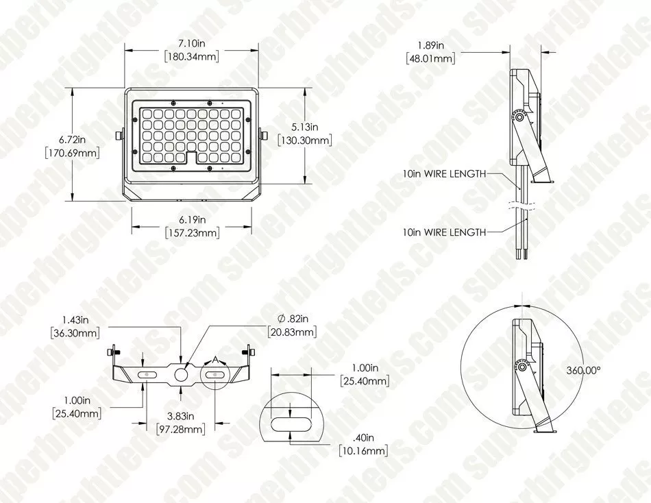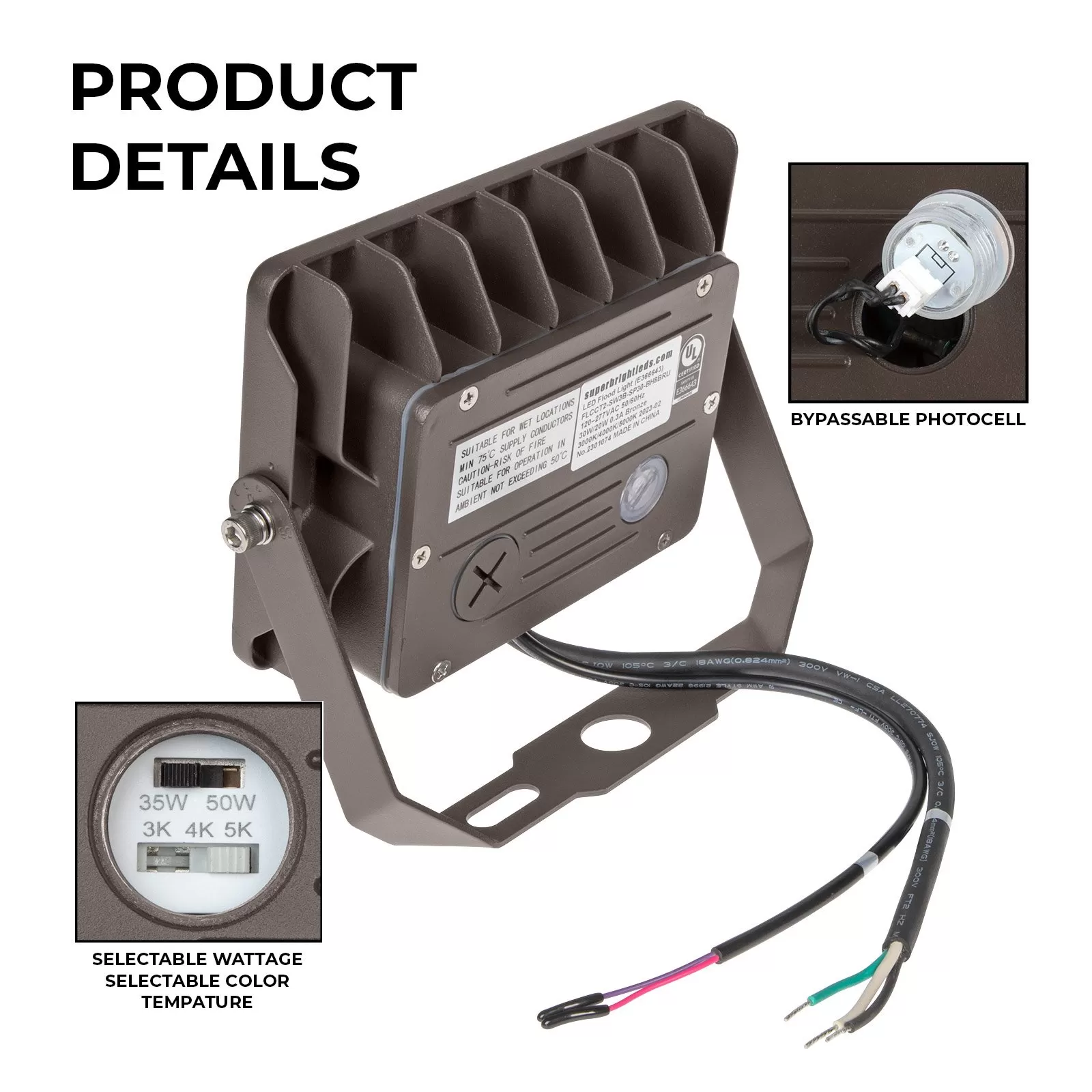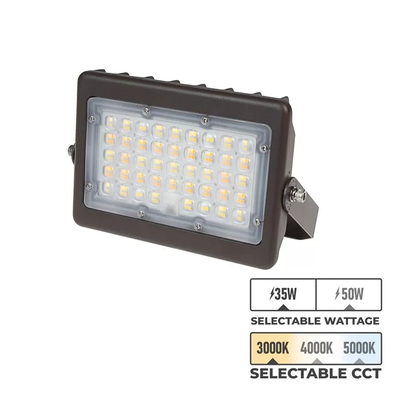 The LED flood light with field-selectable color temperature and wattage features a wide NEMA 7×7 light distribution pattern for area lighting, landscape lighting, and building facade lighting. Select the desired color temperature or wattage by removing the cap on the back of the fixture and using the switch to choose between 3000K, 4000K, and 5000K or 35W and 50W. To bypass the integrated photocell, remove the clear cap on the back of the fixture and unplug the photocell. The heavy-duty die-cast aluminum housing and polycarbonate lens protect the fixture in extreme weather conditions. The pre-installed yoke mount can be adjusted 180° for precise light direction. Other mount options are available.