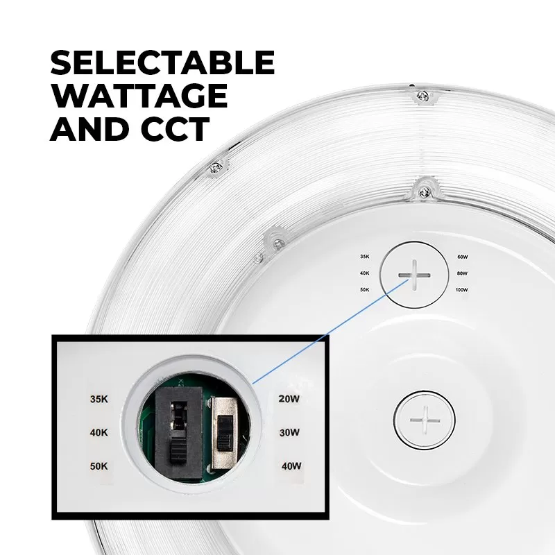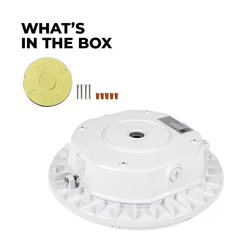 The LED parking garage canopy light features three field selectable color temperatures and wattages. The light delivers up to 5,400 lumens, equivalent to a 125W metal-halide fixture. Select the wattage and CCT via externally accessible switches for maximum utility. This energy-efficient fixture lights outdoor spaces enhancing safety and security while reducing operating costs. Compatible with an optional motion sensor for added energy savings. Easily surface mount with the included hardware or pendant mount the fixture using the 3/4” conduit entry point. Ideal for parking garages, gas stations, and outdoor commercial applications.