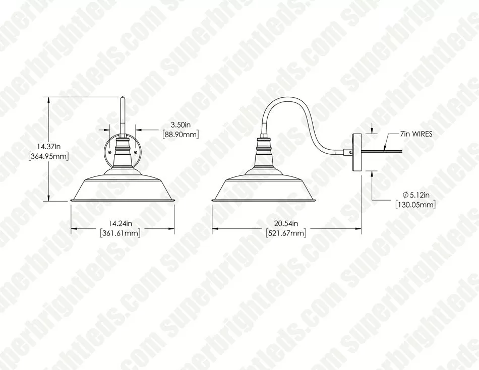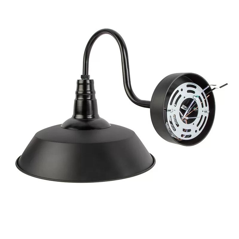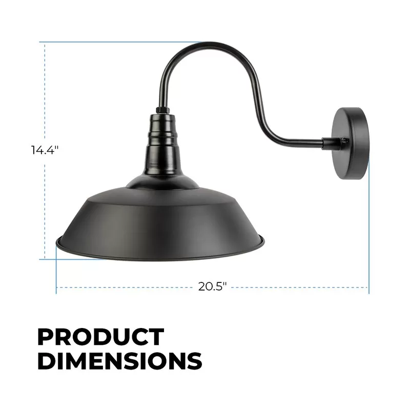 The LED ready gooseneck barn light is equipped with an E26 base, making it compatible with a range of LED light bulbs. The fixture has a classic barn light style with a decorative black finish to complement traditional and modern designs. Durable steel construction with a weatherproof IP43 rating makes the fixture suitable for outdoor applications. The fixture’s 14” shade directs light downward for entryway and garage applications.
