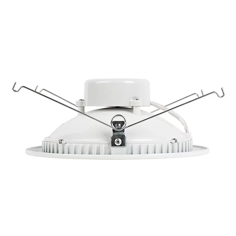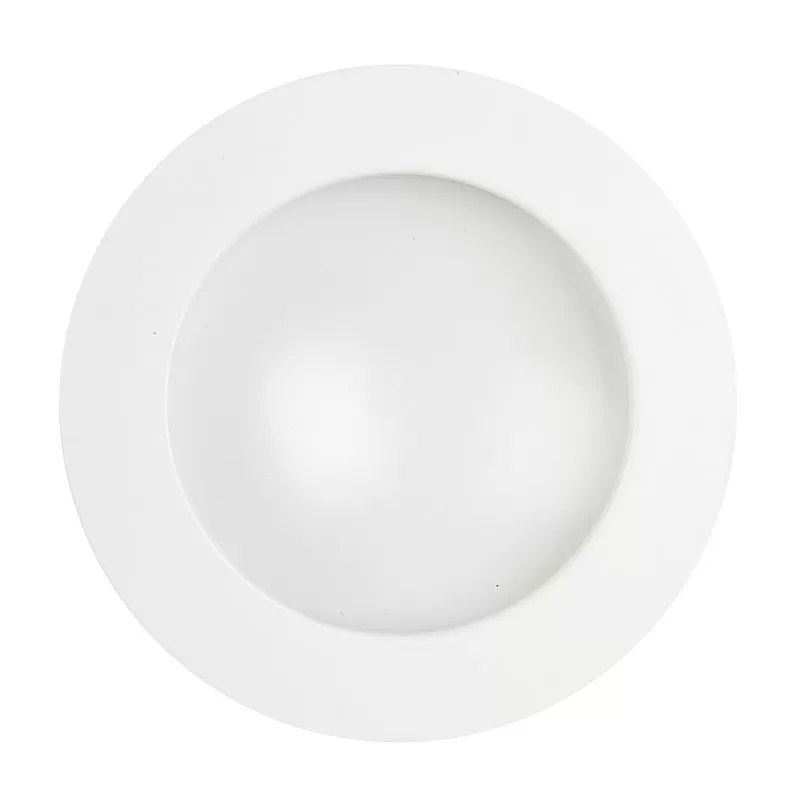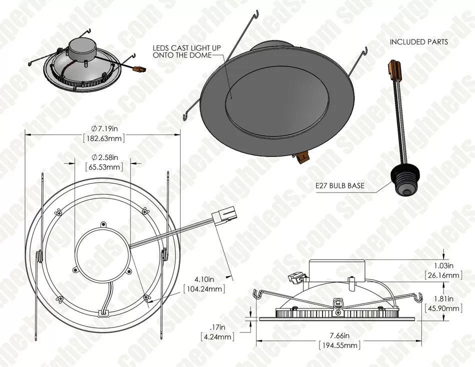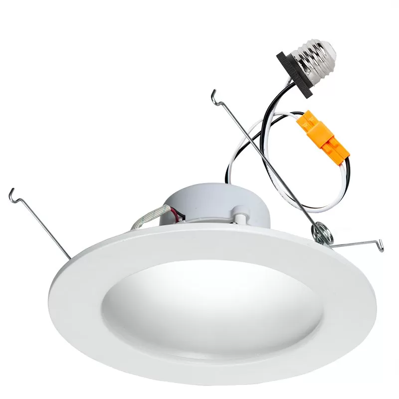 The unique design of DL56DI series Can Light creates muted illumination to enhance residential or commercial spaces with out sacrificing brightness. LEDs shine upward into a concave lens that distributes a volumetric beam of light. with an E26/E27 screw base adapter, this kit can retrofit in place of bulky incandescent fixtures or install in new builds. Lightweight housing has a white finish and conveniently mounts in 6″ recess using attached retaining clips. Using only 15-watts, this dimmable downlight solution can compliment kitchens