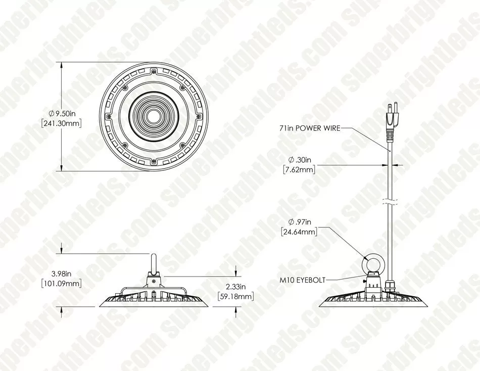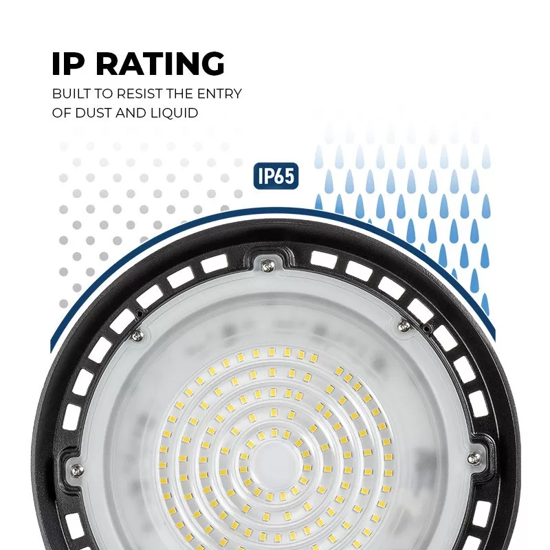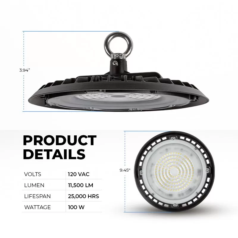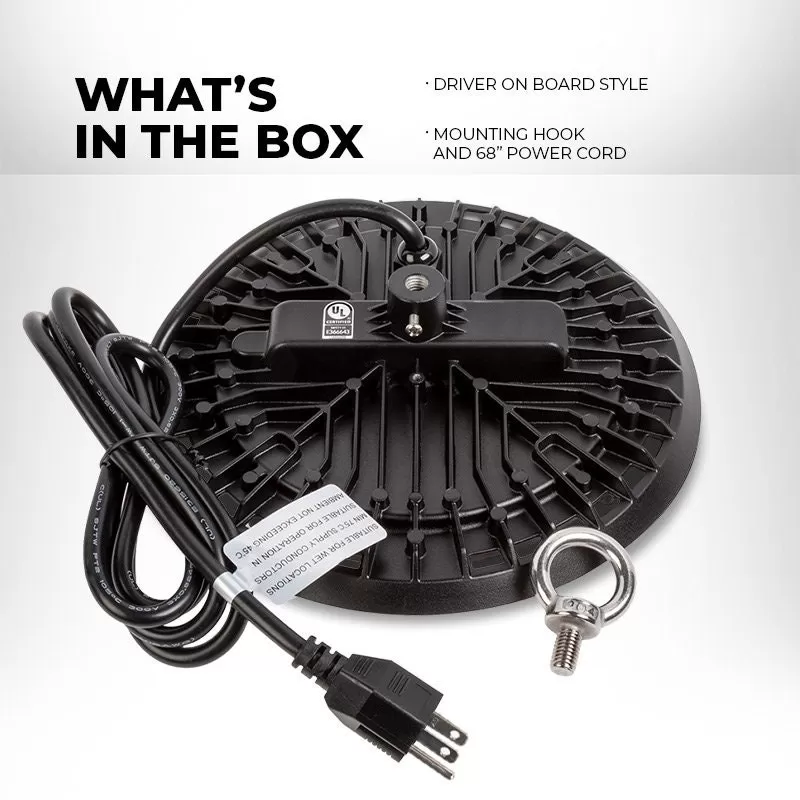The UFO LED high bay with an integrated driver is designed to replace round metal halide high bays and lower maintenance and energy costs. The built-in driver design eliminates the need for an external driver, making the fixture more compact. The UFO high bay has an economical design and commercial-grade operation, delivering 11,500 lumens at 100W. Easily install using the 3-prong electrical plug. When installing in wet/damp areas, a GFCI outlet is required. Ideal for pole barns, garages, and workspaces.