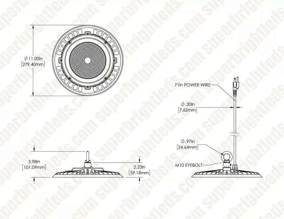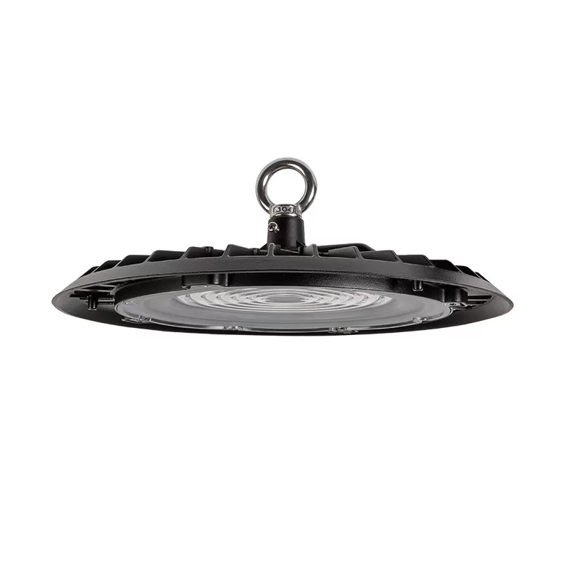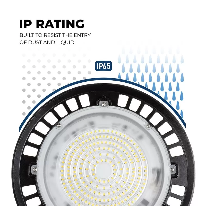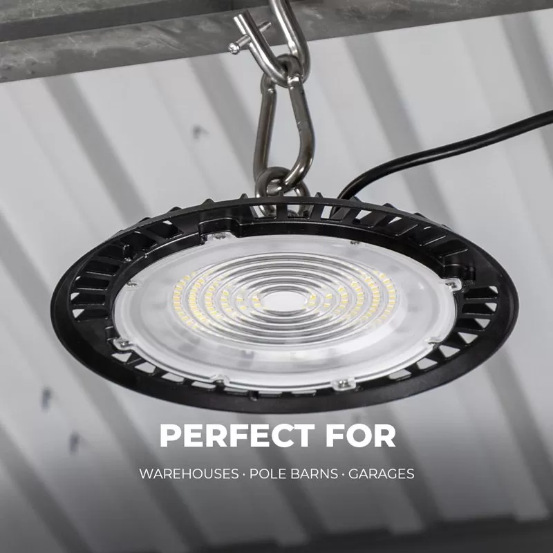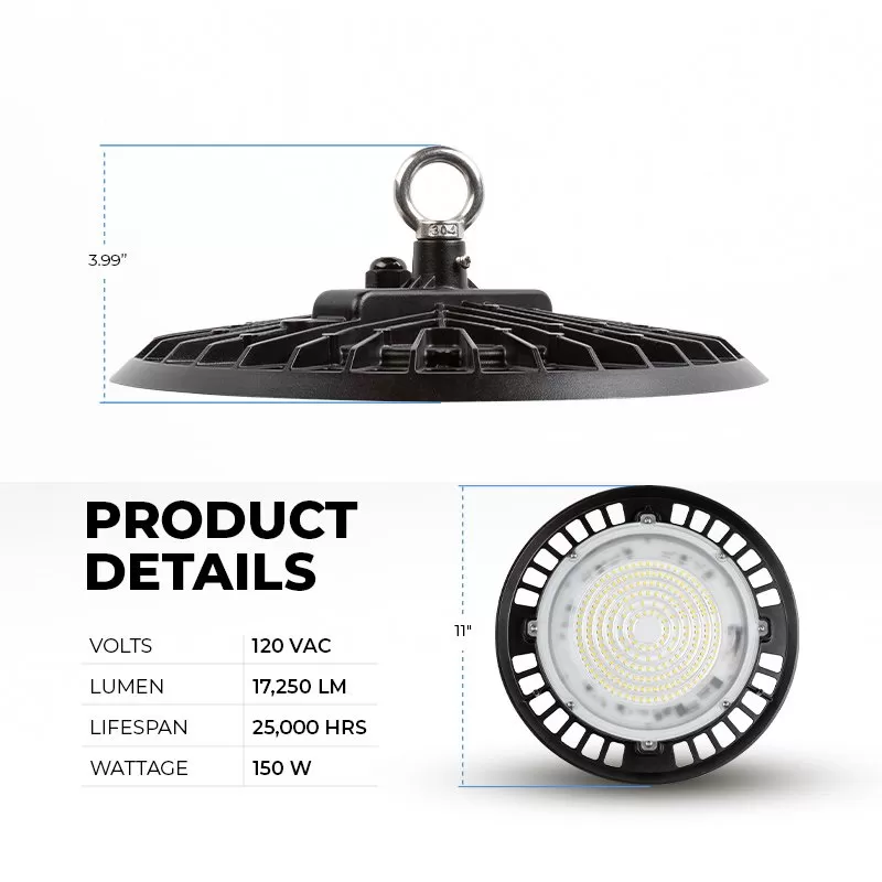 The UFO LED high bay with an integrated driver is designed to replace round metal halide high bays and lower maintenance and energy costs. The built-in driver design eliminates the need for an external driver, making the fixture more compact. The UFO high bay has an economical design and commercial-grade operation, delivering 17,250 lumens at 150W. Easily install using the 3-prong electrical plug. When installing in wet/damp areas, a GFCI outlet is required. Ideal for pole barns, garages, and workspaces.