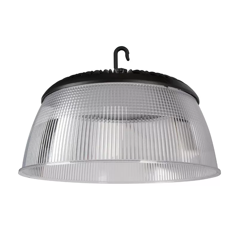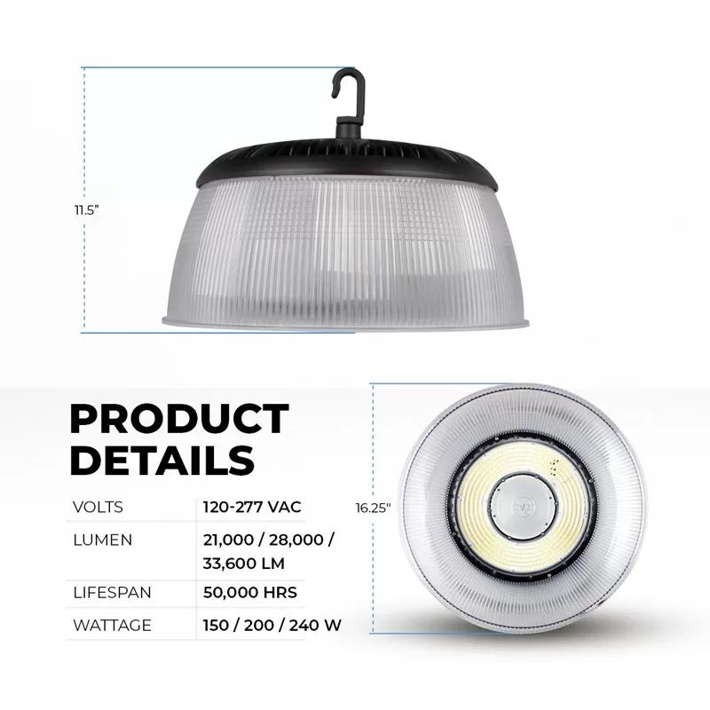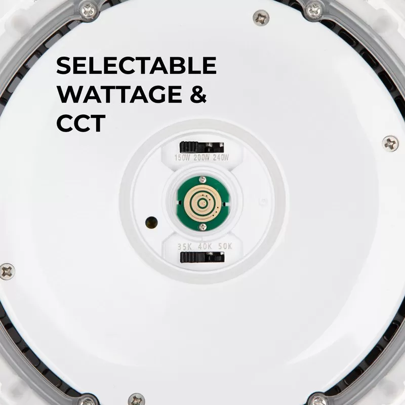 The LED UFO high bay with field selectable wattage and color temperature produces up to 33,600 lumens and is equivalent up to 1,000W metal halide fixtures. Using the selectable power and color switches on the underside of the light in the middle of the lens, select between 150W, 200W, and 240W and 3500K, 4000K, and 5000K to tailor the fixture to the application setting. The fixture’s 0-10V dimmable driver is designed to work with dimming control or operate with an optional microwave motion sensor or a PIR motion sensor (sold separately). With its durable aluminum housing and polycarbonate lens the fixture can operate in temperatures between -40°F to 113°F and is suitable for wet locations. Included reflector ensures unfirom light distribution and makes the fixture look like traditional metal halides.