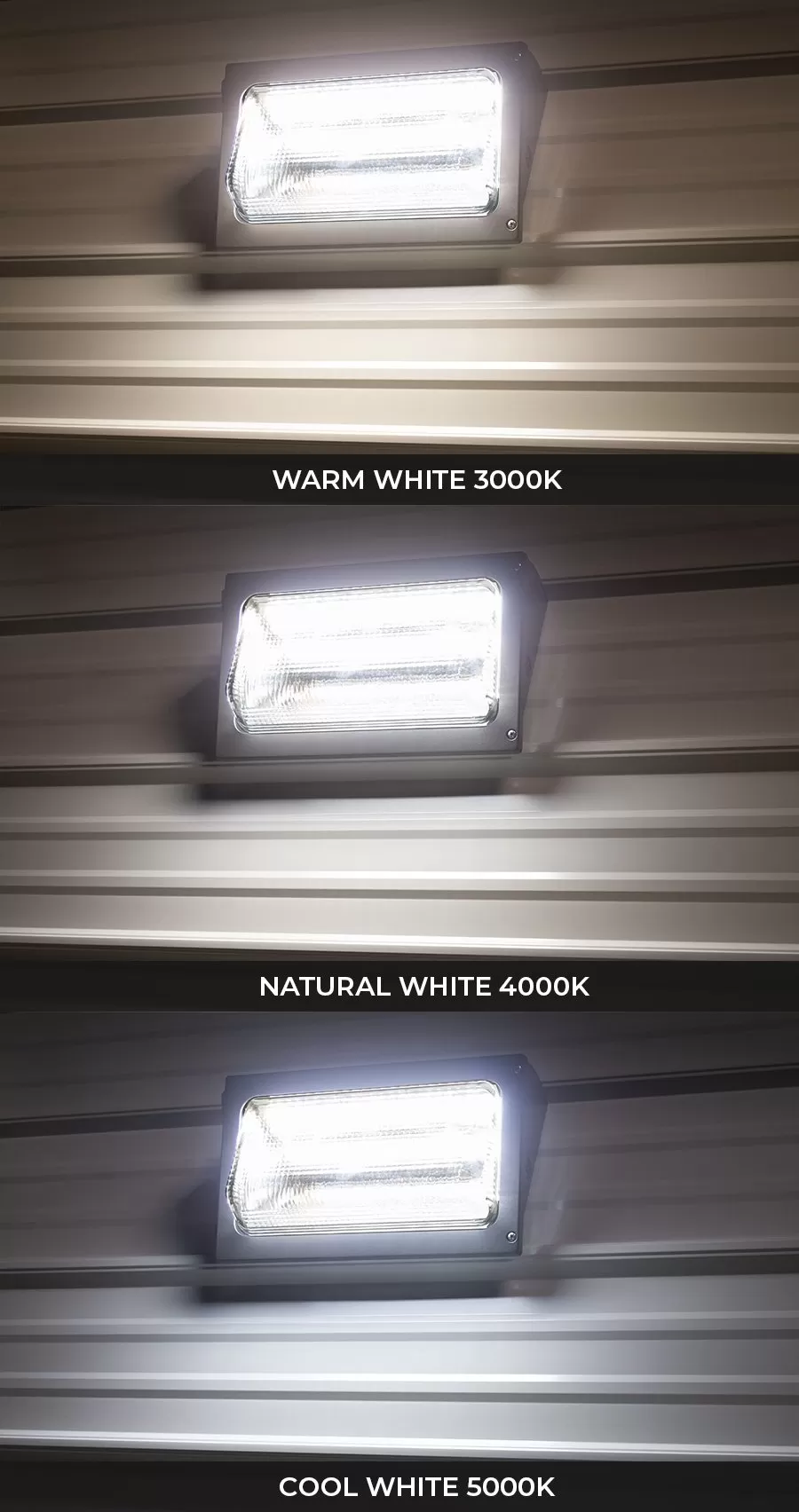 This LED wall pack features selectable CCT and wattage to customize the fixture to the application area. The integrated photocell simplifies operation and can be bypassed by unplugging it. The fixture is constructed of a bronze die-cast aluminum housing, a long-lasting glass lens, and is rated IP65 for outdoor installations. Traditional design directs light downward, decreasing wasted light. Wide beam distribution is ideal for parking lots, building exteriors, and warehouses.