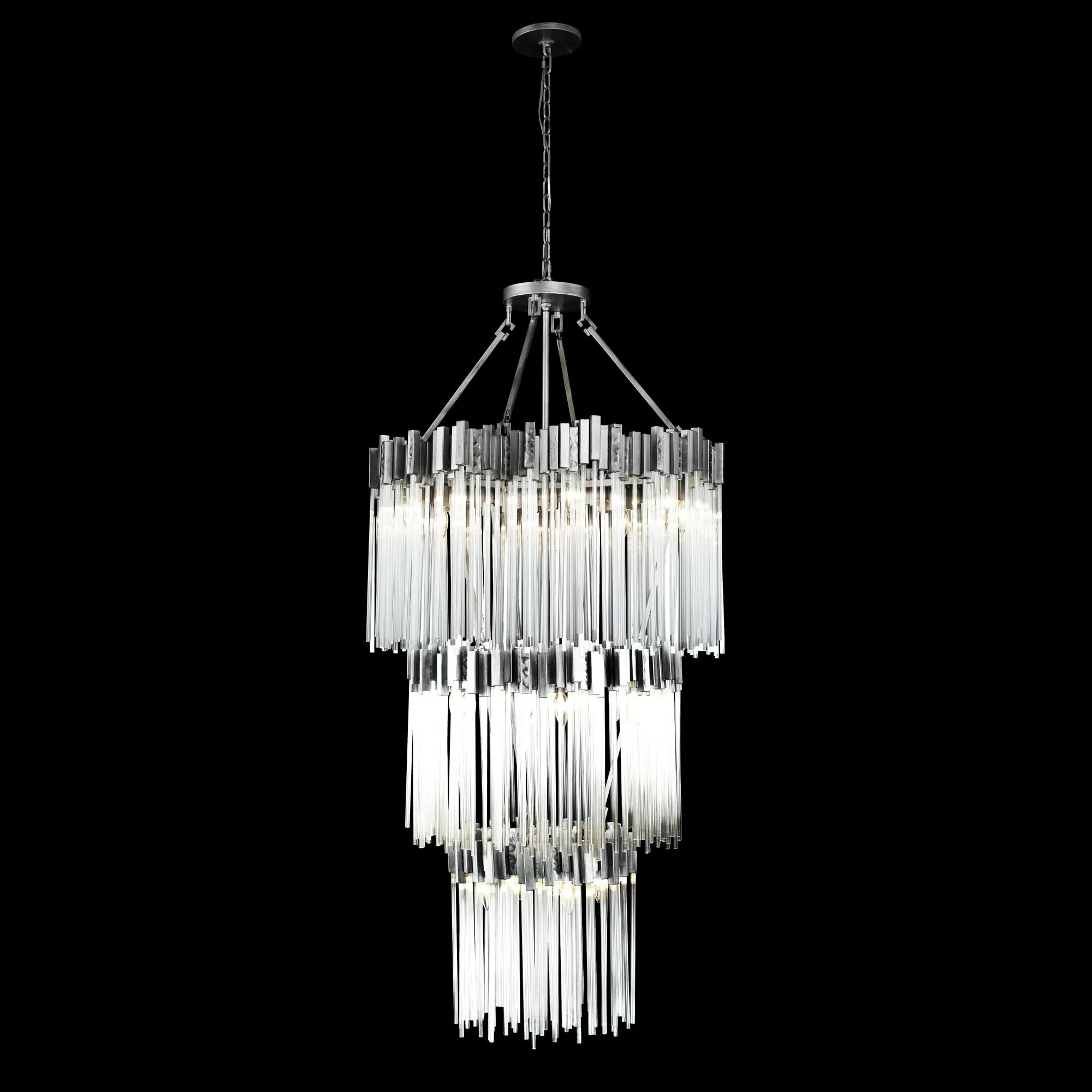 Hand Forged Recycled Steel. Handsomely Hammered Elements. Fluted 70’S Inspired Clear Glass Rods.