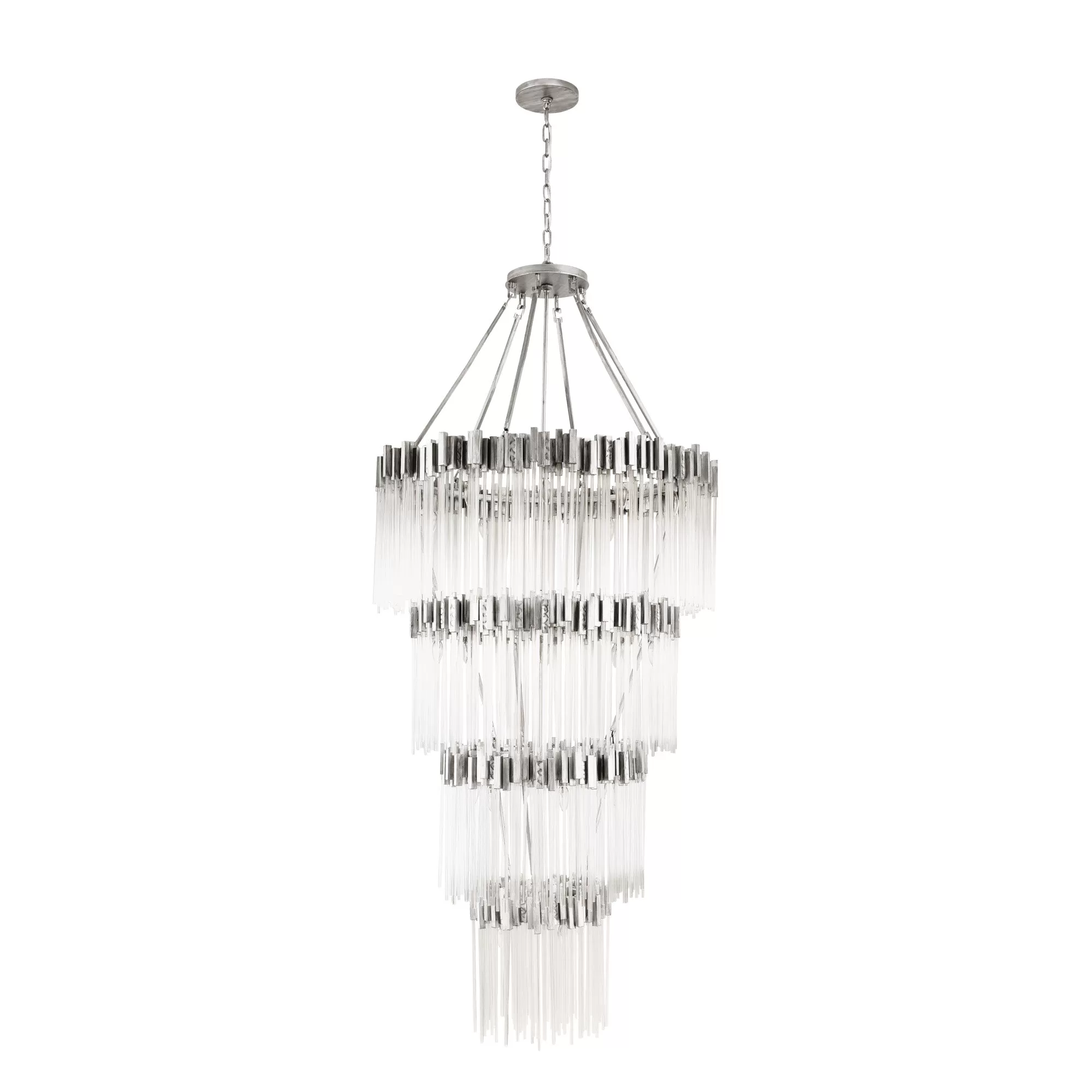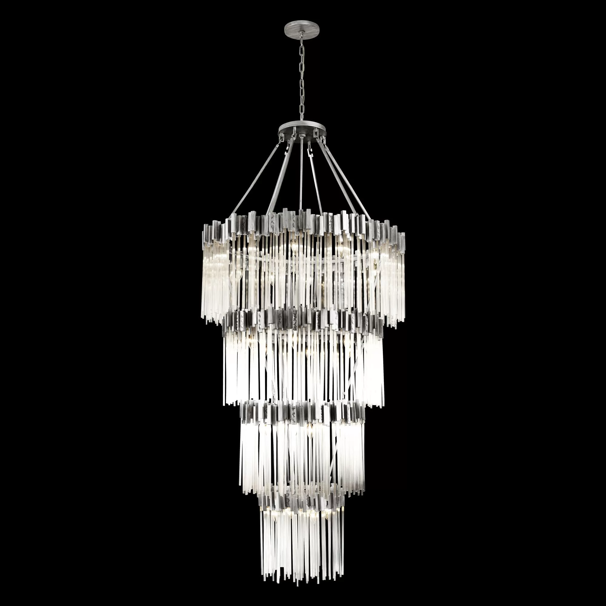 Hand Forged Recycled Steel. Handsomely Hammered Elements. Fluted 70’S Inspired Clear Glass Rods.