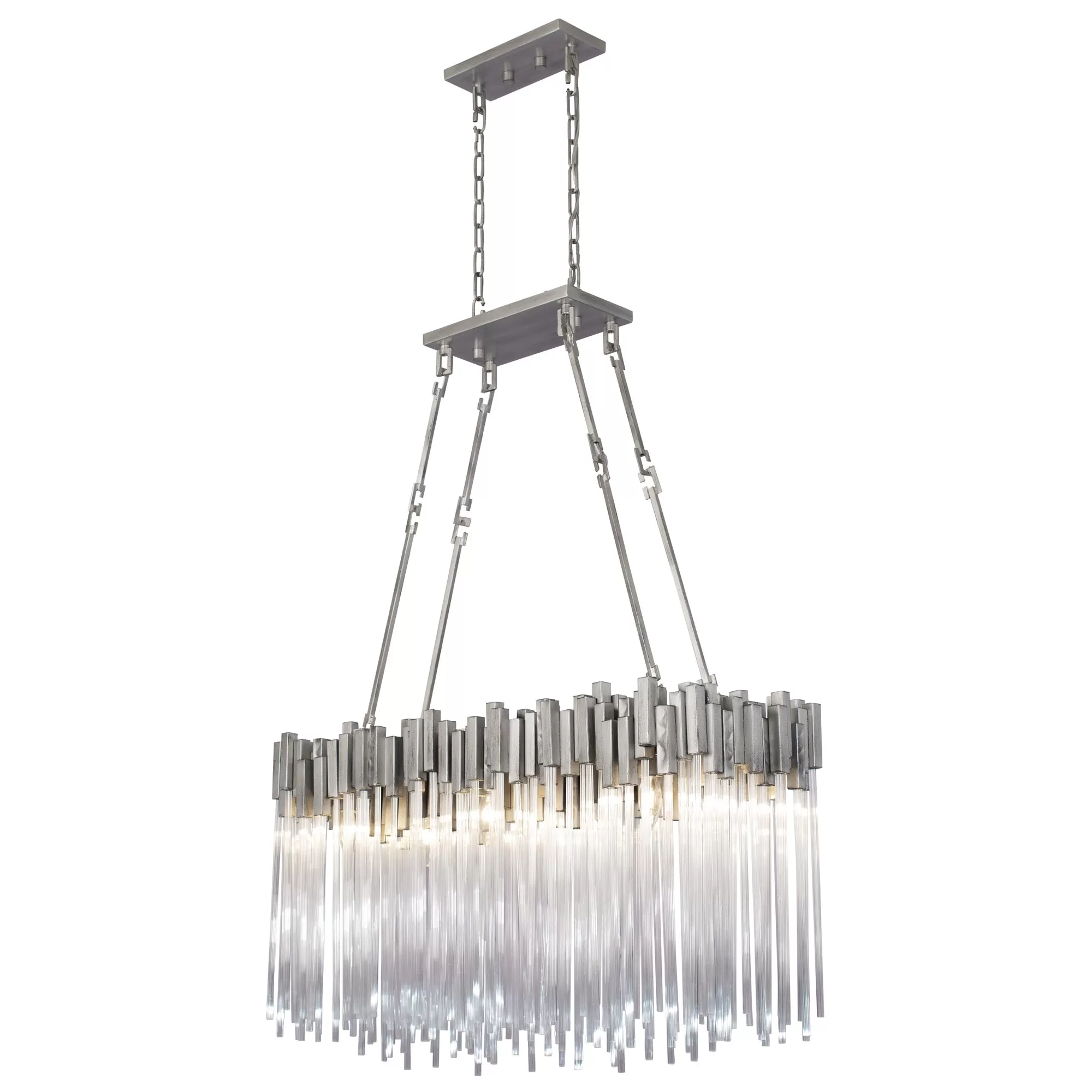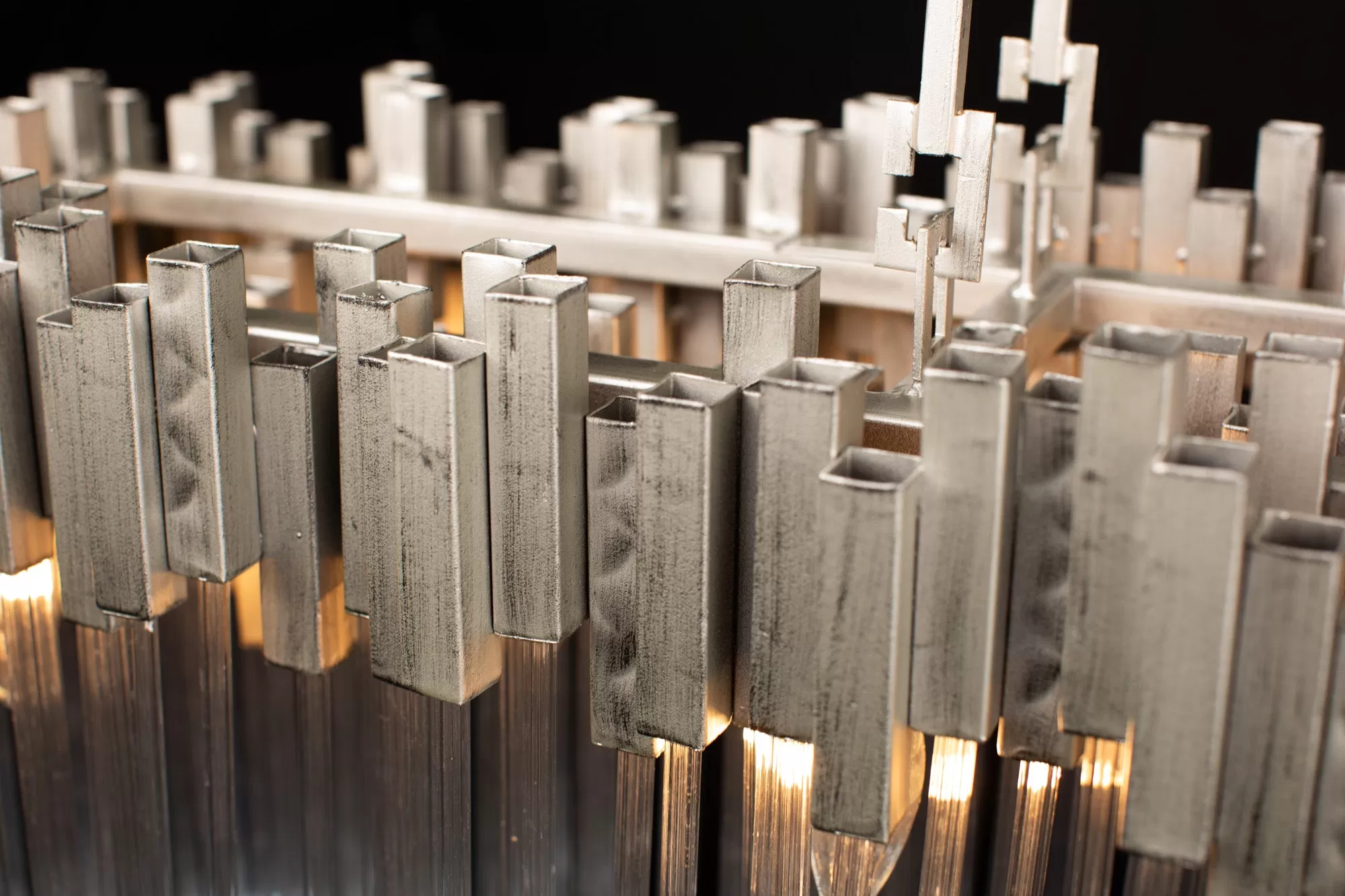 Hand Forged Recycled Steel. Handsomely Hammered Elements. Fluted 70’S Inspired Clear Glass Rods.