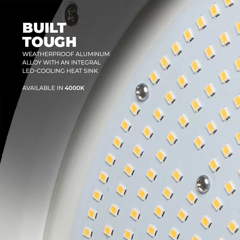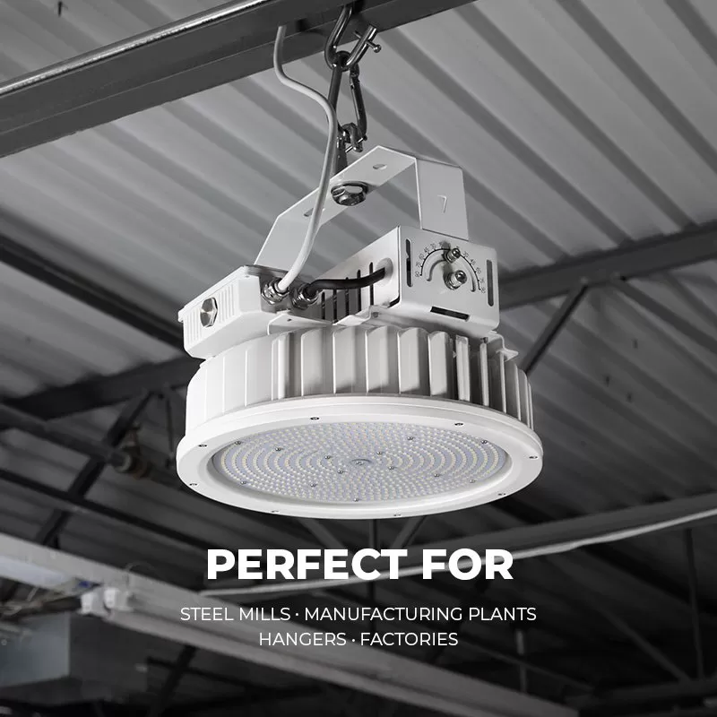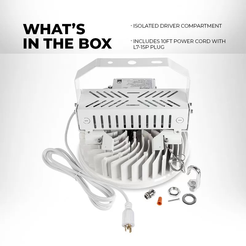 The MaxLite 240W High Voltage High Temperature LED Round High Bay is specifically designed to provide reliable illumination in industrial locations with high ceilings and high ambient operating temperatures up to 60° C, such as steel mills, heavy manufacturing plants, and hangars. A superior thermal management system ensures consistent light levels and exceptional efficacy of 130 lm/W in hot environments. The fixture is IP66 rated and wet location listed to withstand wash downs and protect against the ingress of dust, oil, and other non-corrosive materials.