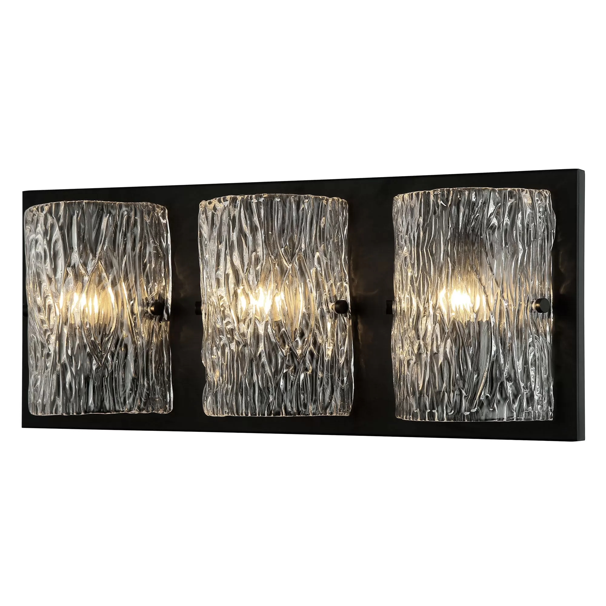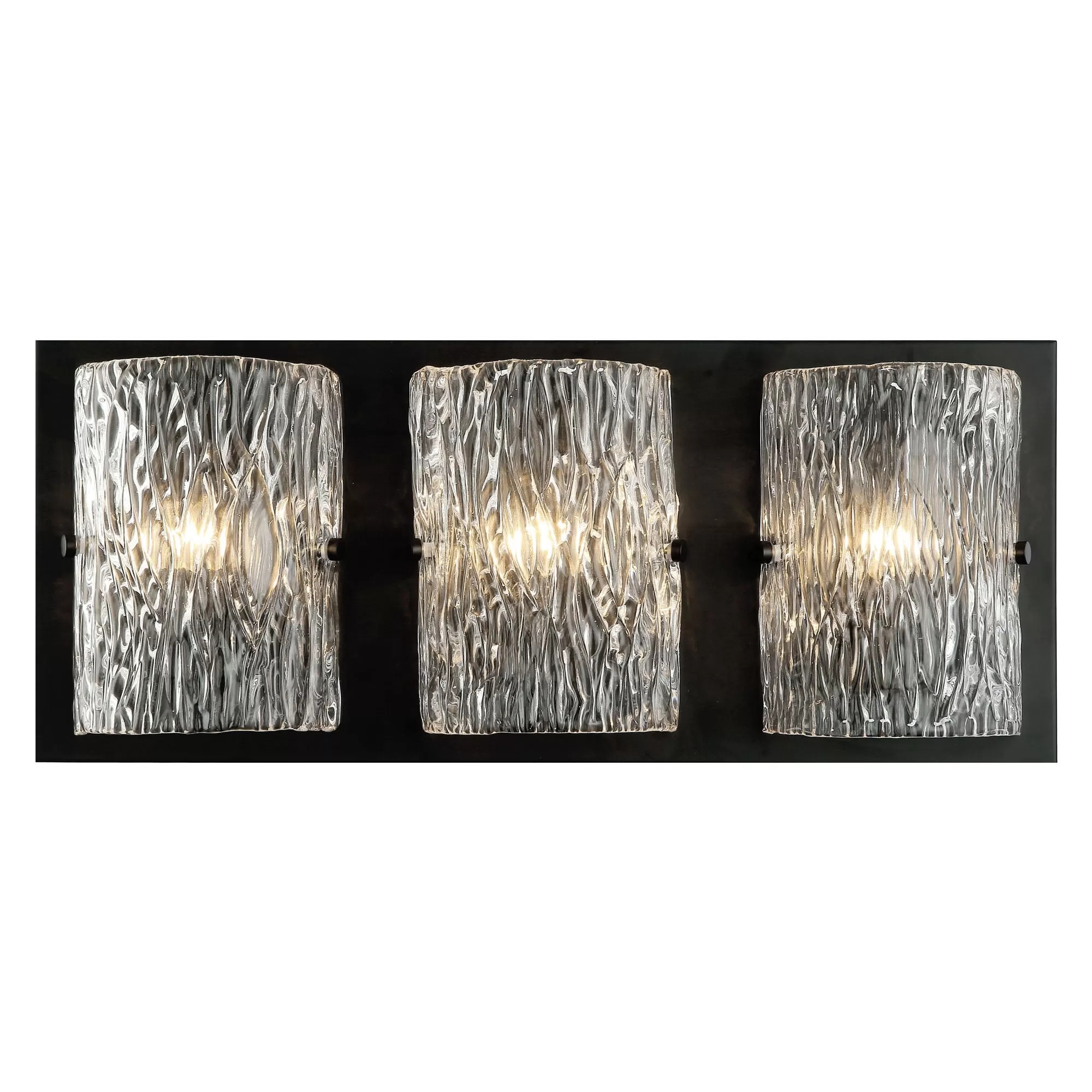 Hand-made Ice Glass with Pattern Stamped on Both Sides. Slightly Oversize Back Plate Creates a Visual Frame. Adjustable Hardware.