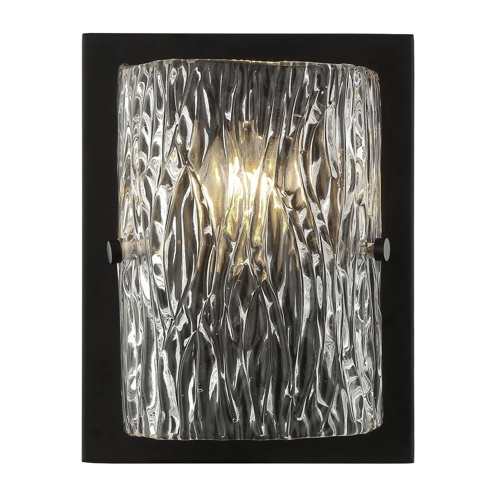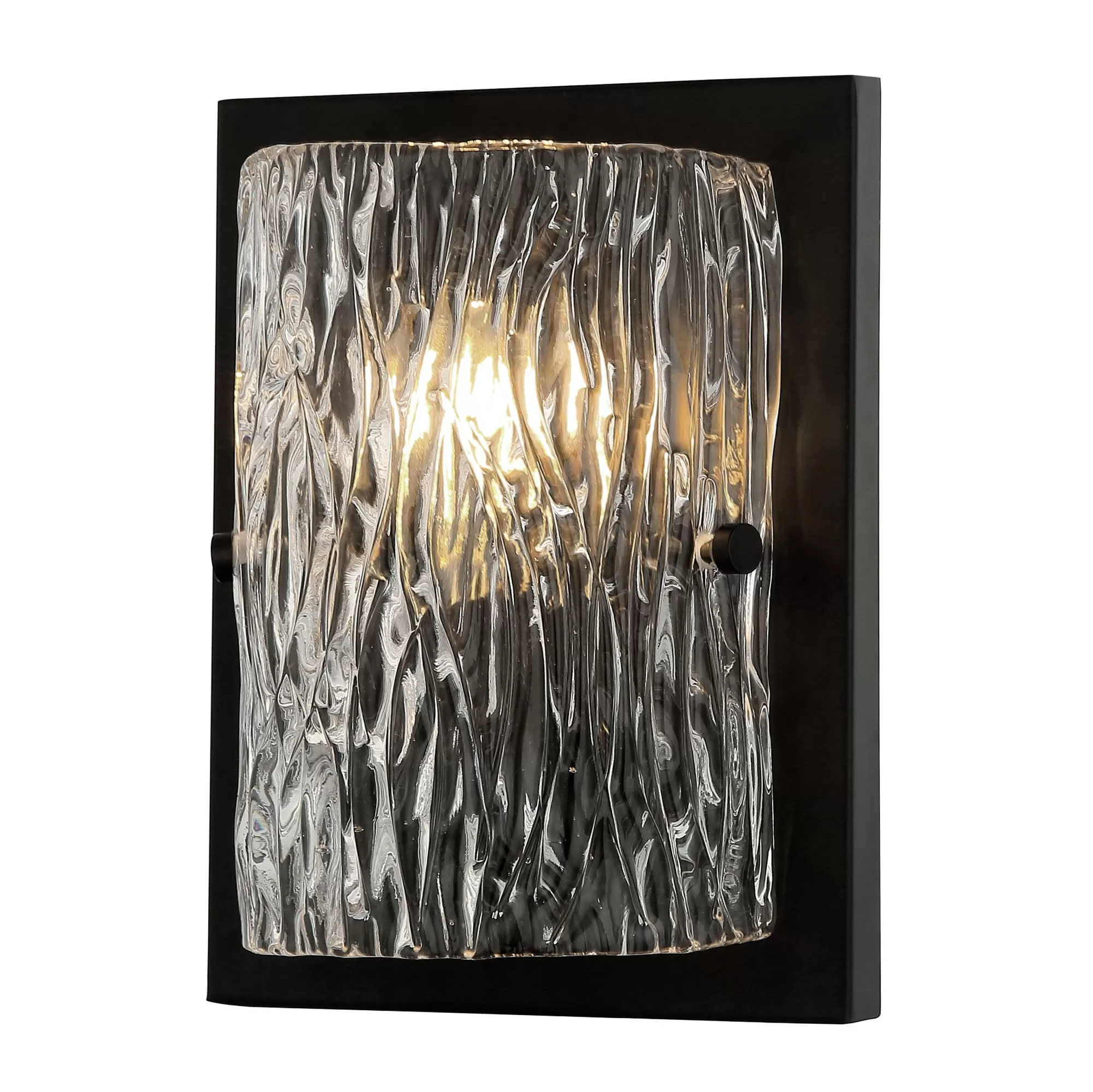 Hand-made Ice Glass with Pattern Stamped on Both Sides. Slightly Oversize Back Plate Creates a Visual Frame. Adjustable Hardware.