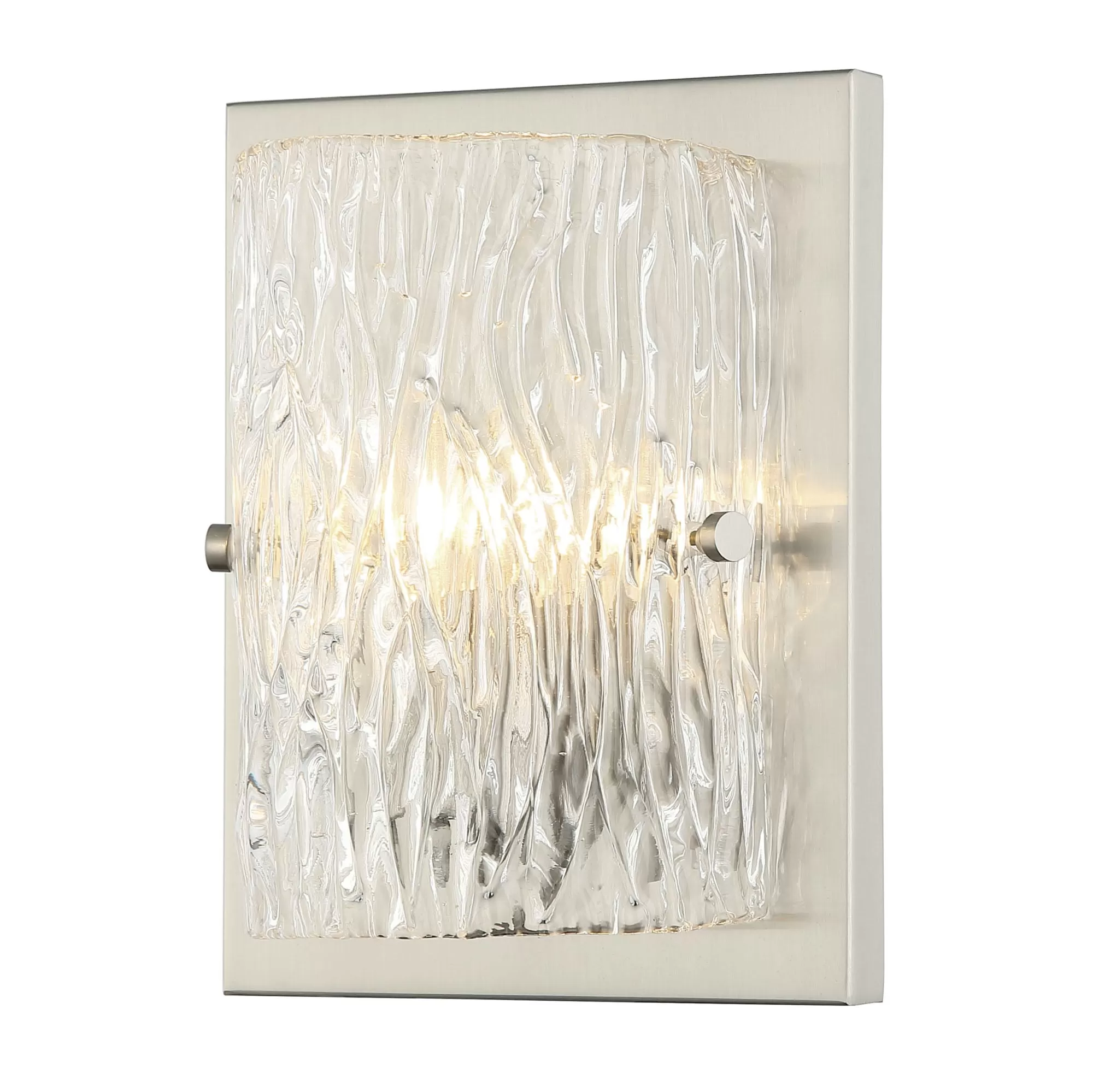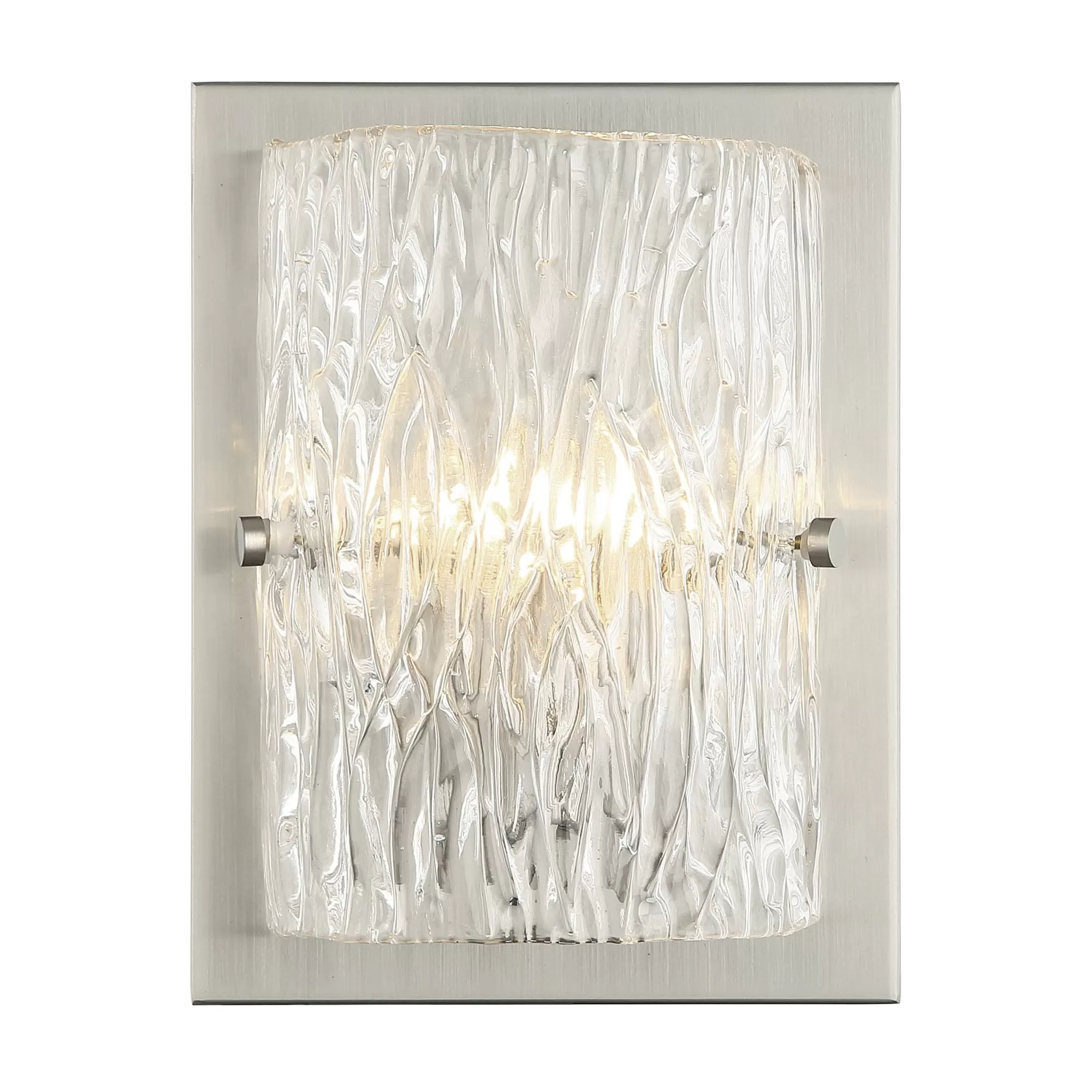 Hand-made Ice Glass with Pattern Stamped on Both Sides. Slightly Oversize Back Plate Creates a Visual Frame. Adjustable Hardware.