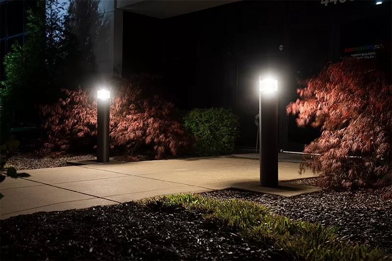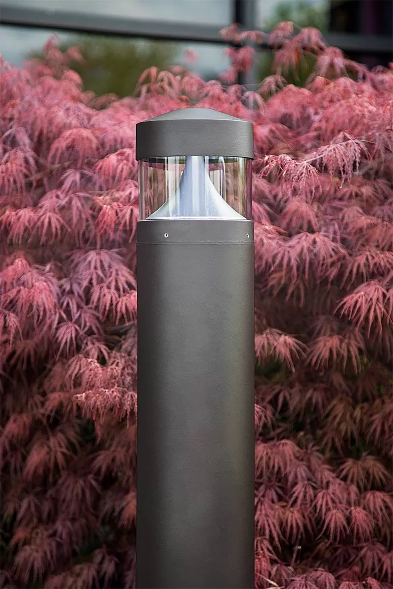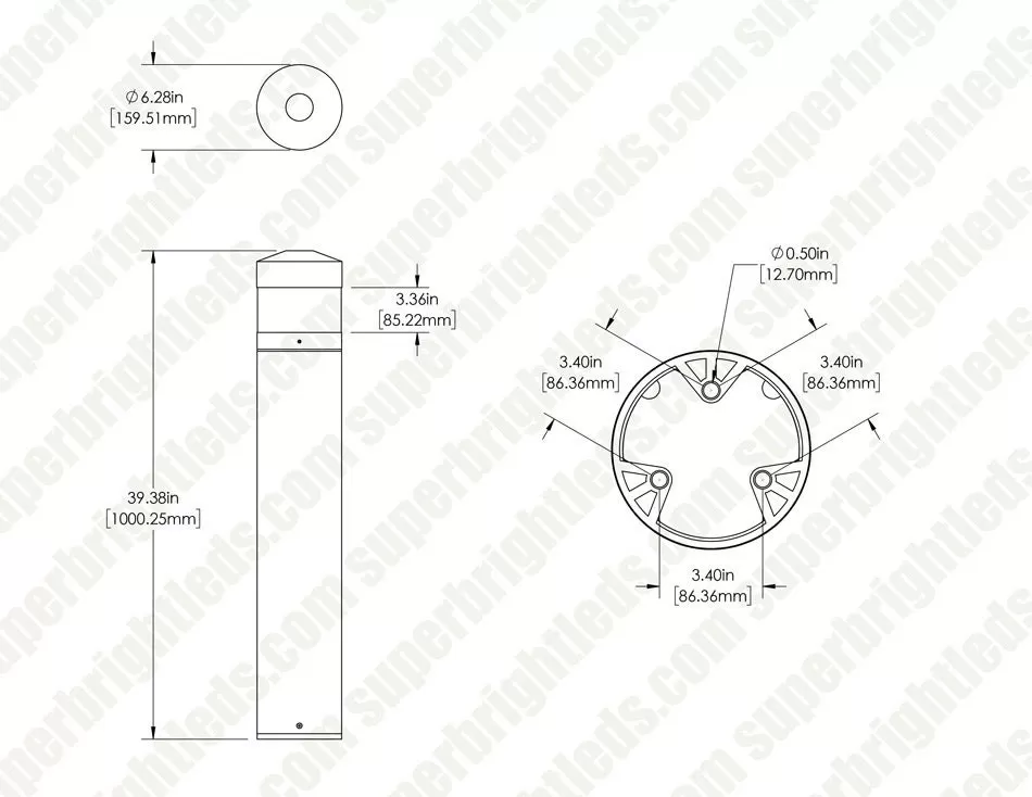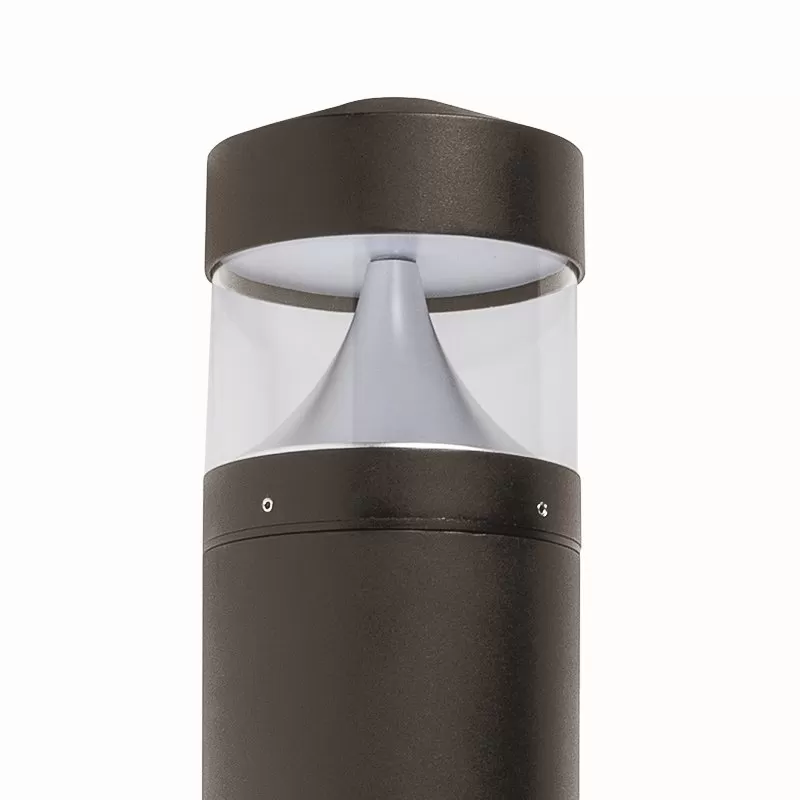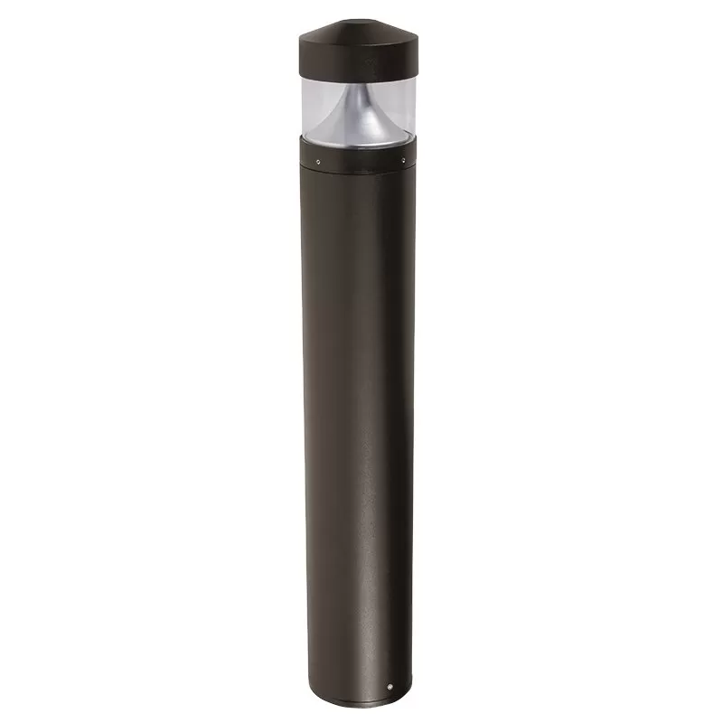 Light up outdoor walkways, protect pedestrian paths, and add architectural appeal with BLR series Architectural LED Bollard Light. with a bronze finish, the round, bevel-edge design enhances the aesthetic of commercial spaces while providing added security and visibility. Light is diffused with a frosted polycarbonate lens and distributed with a cone reflector. The die cast aluminum body is constructed to seal out moisture and resist corrosion. Integrated LEDs eliminate the hassle of replacing bulbs and ballasts in rusty old bollards. Exterior clear lens protects the internal components while matching the traditional HID style. Optional BLR Anchor Bolt Mounting Bracket is available for new pour concrete installations. Customer supplied anchor bolts can be used for installation in existing concrete.