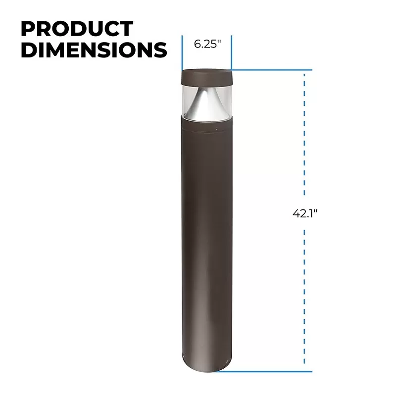 Round LED Bollard brings added safety and aesthetics to commercial locations such as building entryways, pathways, and perimeters. Diffused cone reflector projects downward light for ideal spacing and reduced pedestrian glare. Architectural-grade materials include die cast aluminum housing, powder coated to with stand outdoor conditions. Sealed polycarbonate lens prevents condensation and fogging. with better efficacy and reliability than traditional metal halides, the integrated LEDs eliminate the hassle of replacing bulbs and ballasts in rusty old bollards.