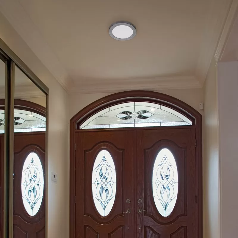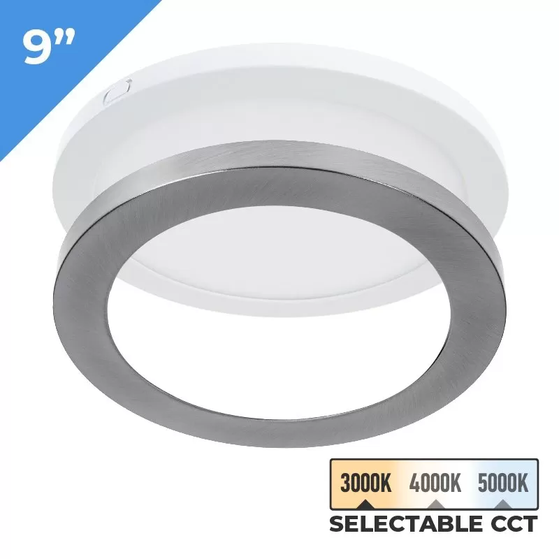 TCP’s 9″ LED Slim Flush Mount Fixtures are perfect for new construction or retrofit projects. They are color selectable and come with a satin nickel magnetic trim ring. The field-selectable CCT allows you to select the color temperature that suits your needs. The frosted lens diffuses the 120° beam angle, producing a uniform light distribution. Install directly to a junction box or within a 5″ or 6″ recessed can. IC Rated for contact with insulation.