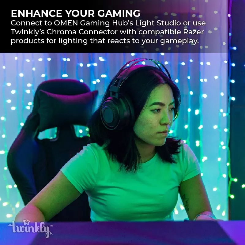 For hands-free control, connect to an Amazon Alexa, Google Home, Apple HomeKit, Homey, and Razer Chroma™ RGB via Twinkly Chroma Connector. To enhance your gaming system, connect the curtain to the OMEN Light Studio on OMEN Gaming Hub for lighting that reacts to your gameplay.