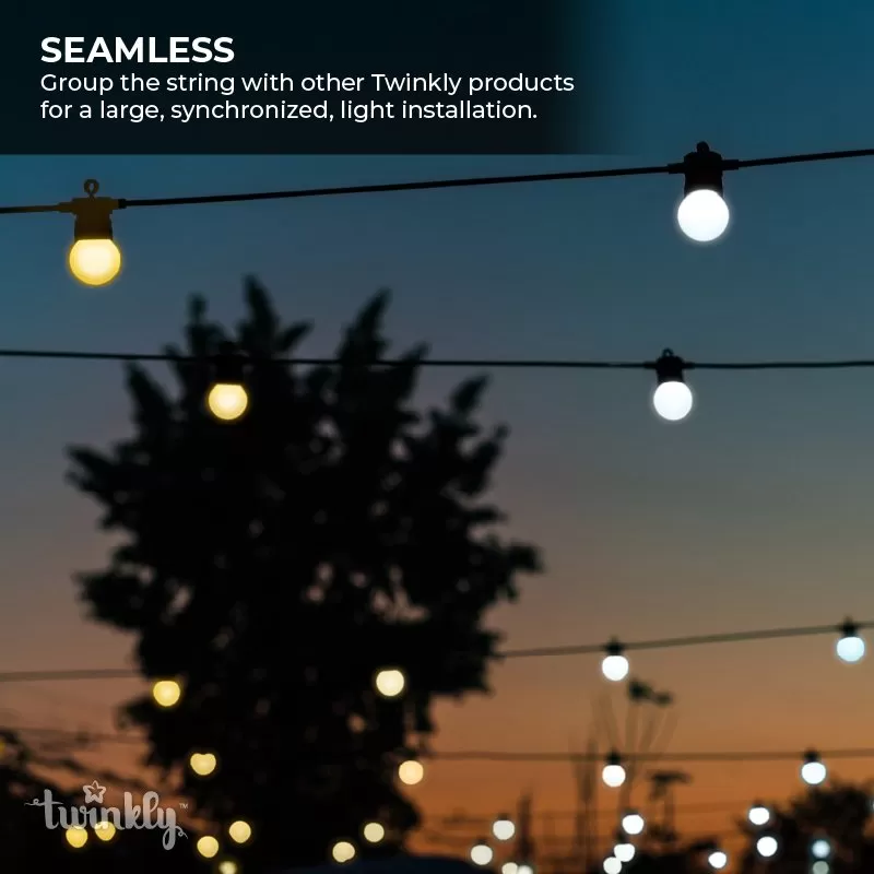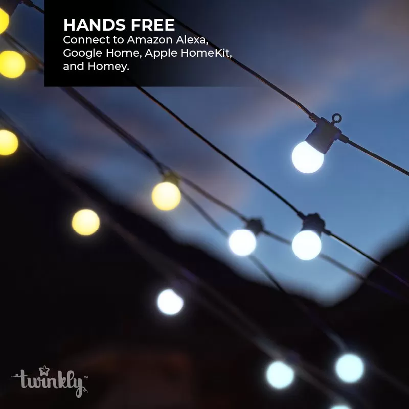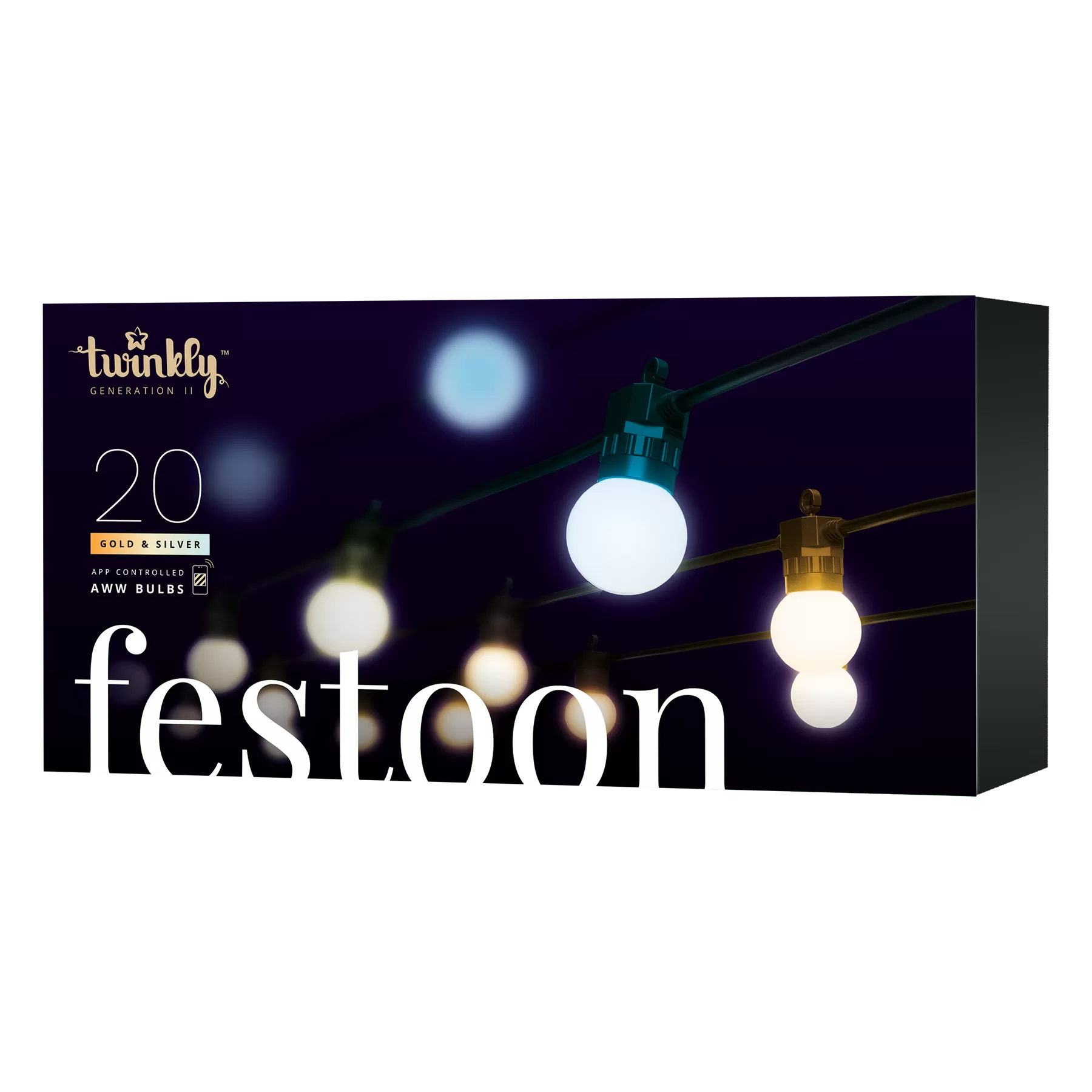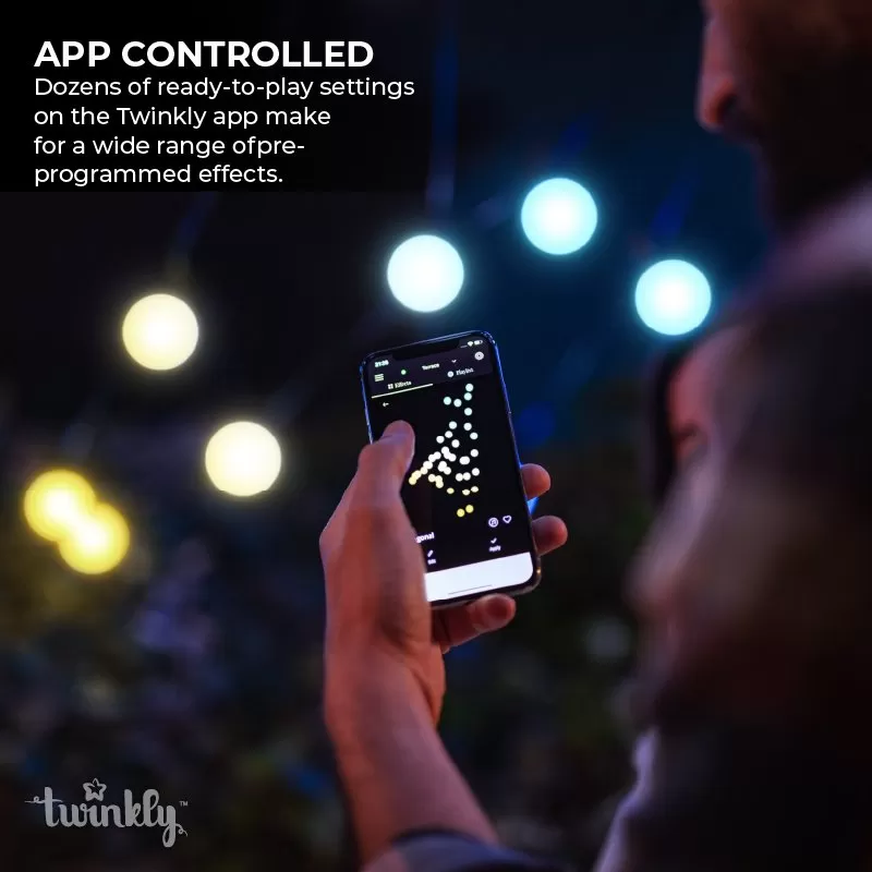 Twinkly Festoon is a smart LED bulb light string that can be controlled with the Twinkly App and vocal assistants. The Festoon Gold & Silver is designed with amber, warm white, and cool white light sources seamlessly set on every single LED. Twinkly Festoon is perfect both for summer and the Christmas season, bringing the most advanced technology to your outdoor lighting decoration. Twinkly Festoon uses a Bluetooth® and Wi-Fi controller with a Twinkly App, allowing you to control each LED individually. Using the app, create your own light design using unique effects, gradients, and color animations, or select from the wide range of pre-programmed effects. Group with other Gold & Silver products by Twinkly for a large, synchronized, light installation.