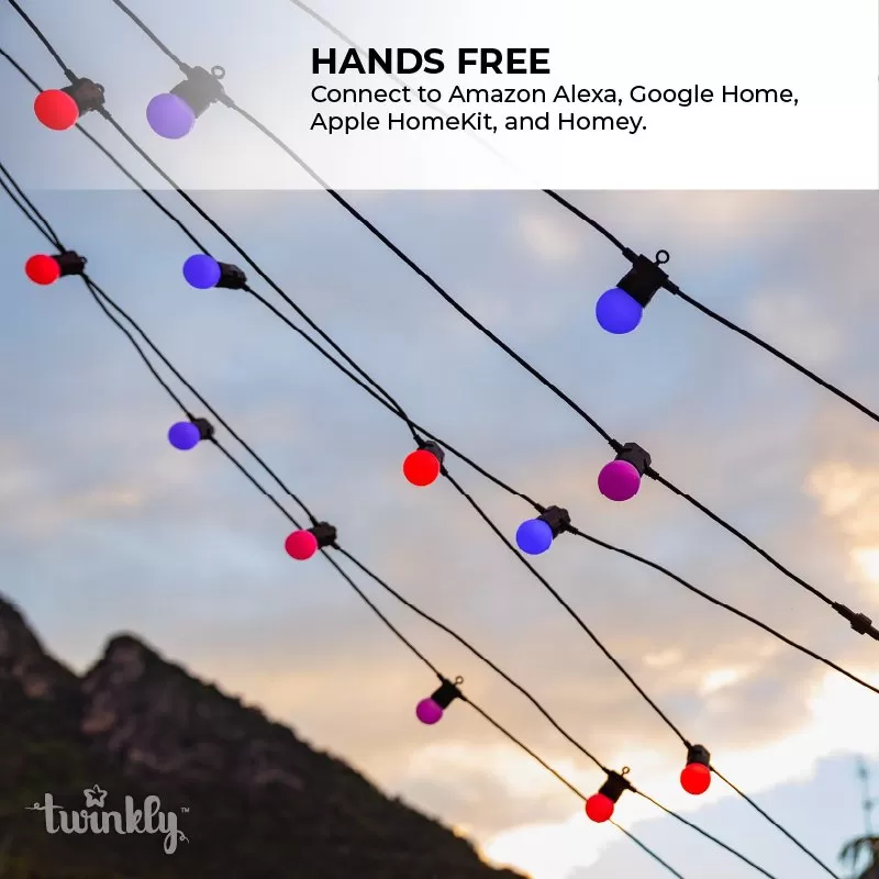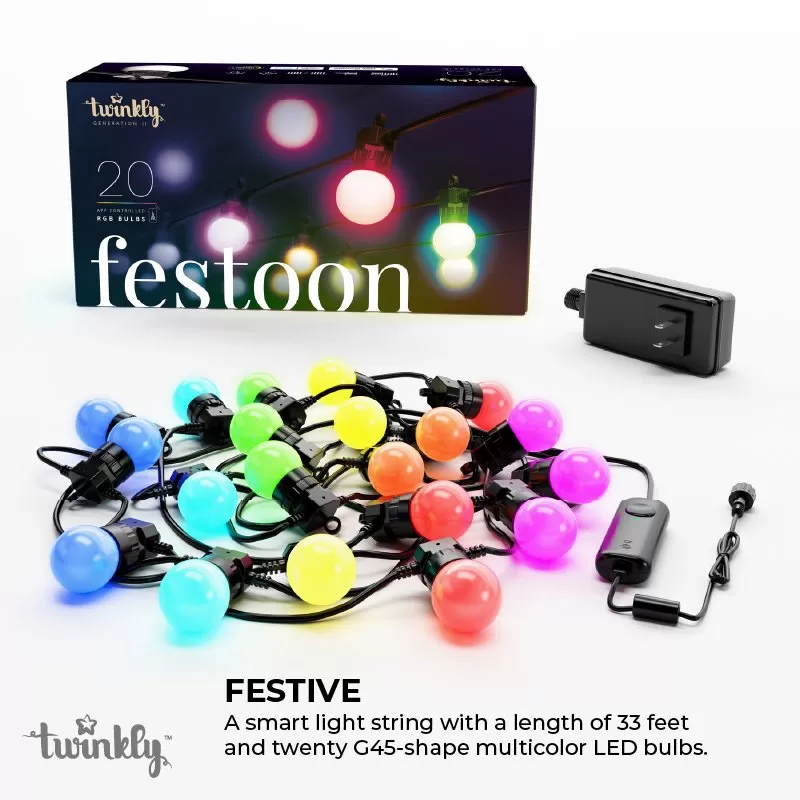 Twinkly Festoon is a smart LED bulb light string that can be controlled with the Twinkly App and vocal assistants. The Festoon Multicolor consists of G45-shaped LED bulbs, perfect for patios and Christmas decor. Twinkly Festoon uses a Bluetooth® and Wi-Fi controller with a Twinkly App, allowing you to control each LED individually. Using the app, create your own light design using unique effects, gradients, and color animations, or select from the wide range of pre-programmed effects. Group with other RGB products by Twinkly for a large, synchronized, light installation.