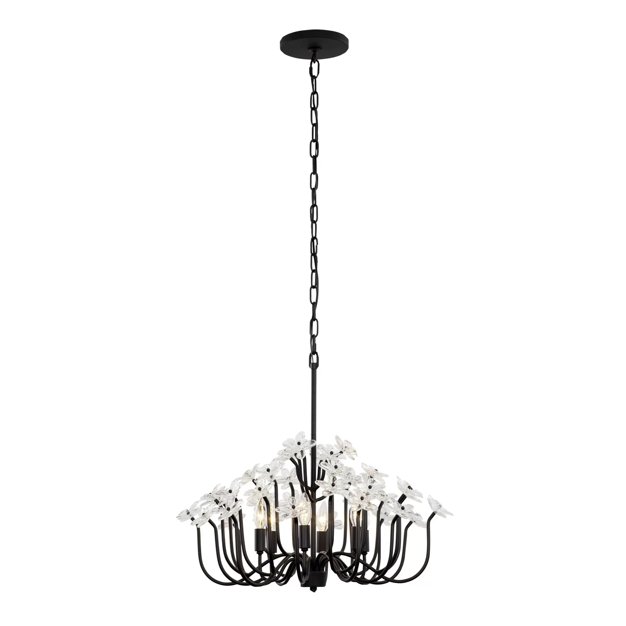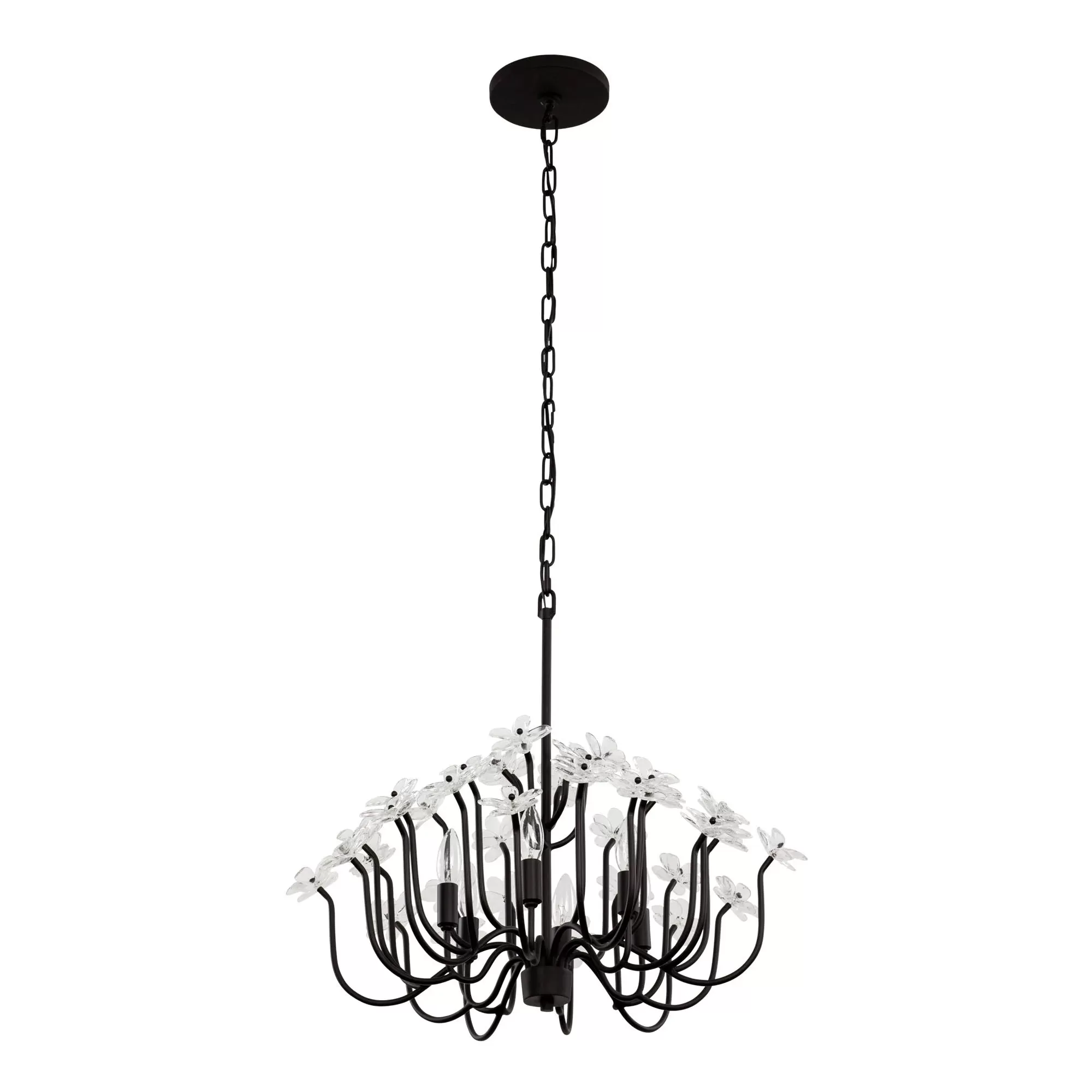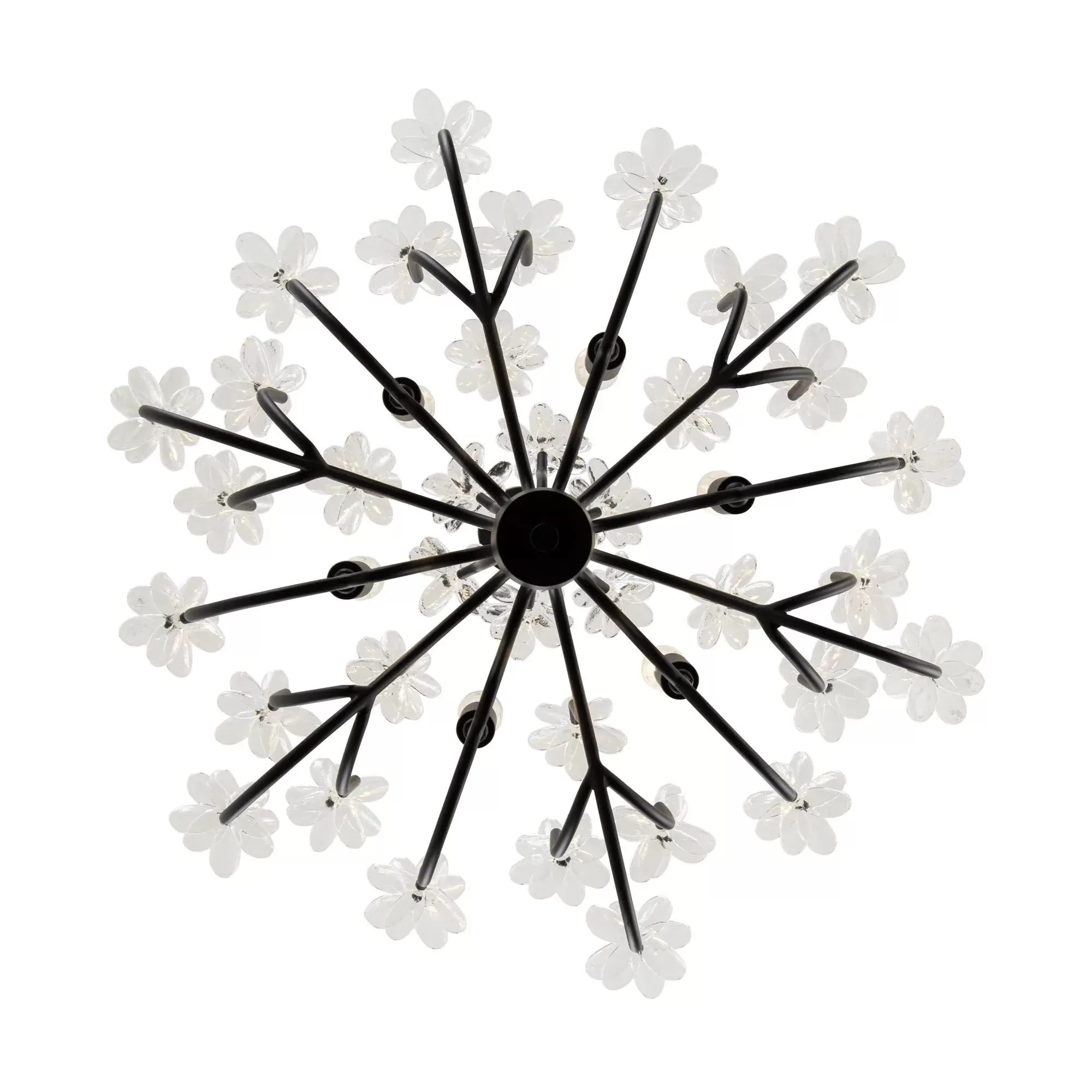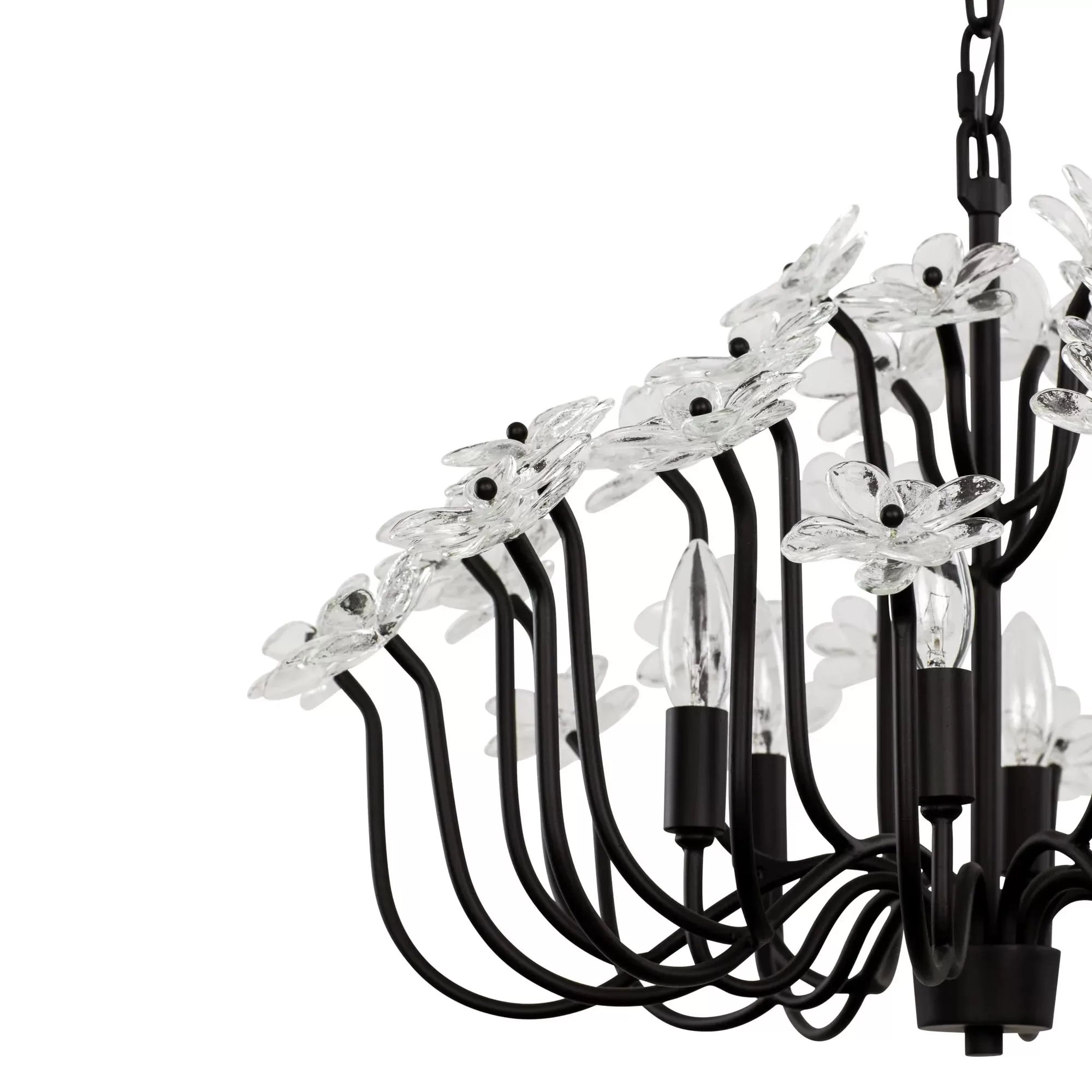 When you first see it aglow with its fine intricacies, it may not show, but the Wildflower collection started its path to existence thanks to Mary V. Walcott’s Oconee-Bells discovered in the Smithsonian Libraries and Archives Special Collections. Taking center stage is a touch of Danish modern on top of midcentury. Wildflower combines delicate, handmade ice glass flower petals, with equally delicate wispy hand-forged and recycled steel tubing and metal work. Available in gold or black.