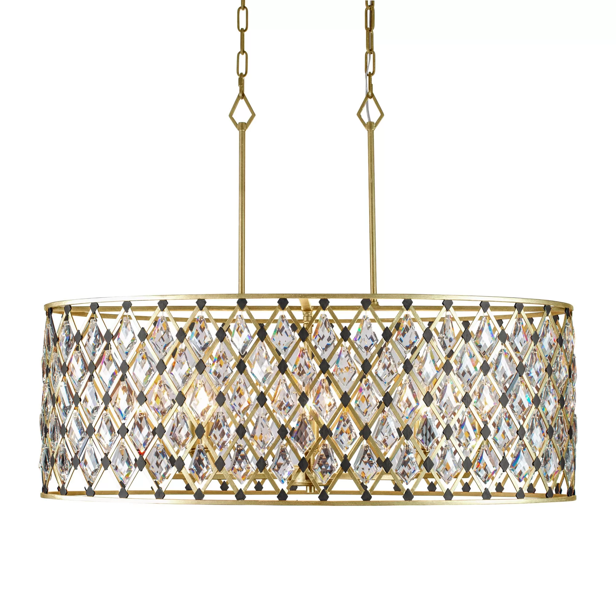 Hand Forged Recycled Steel. Double Harlequin Metal Frame. Premium Kite Shaped Optic Crystal Pendalogues.